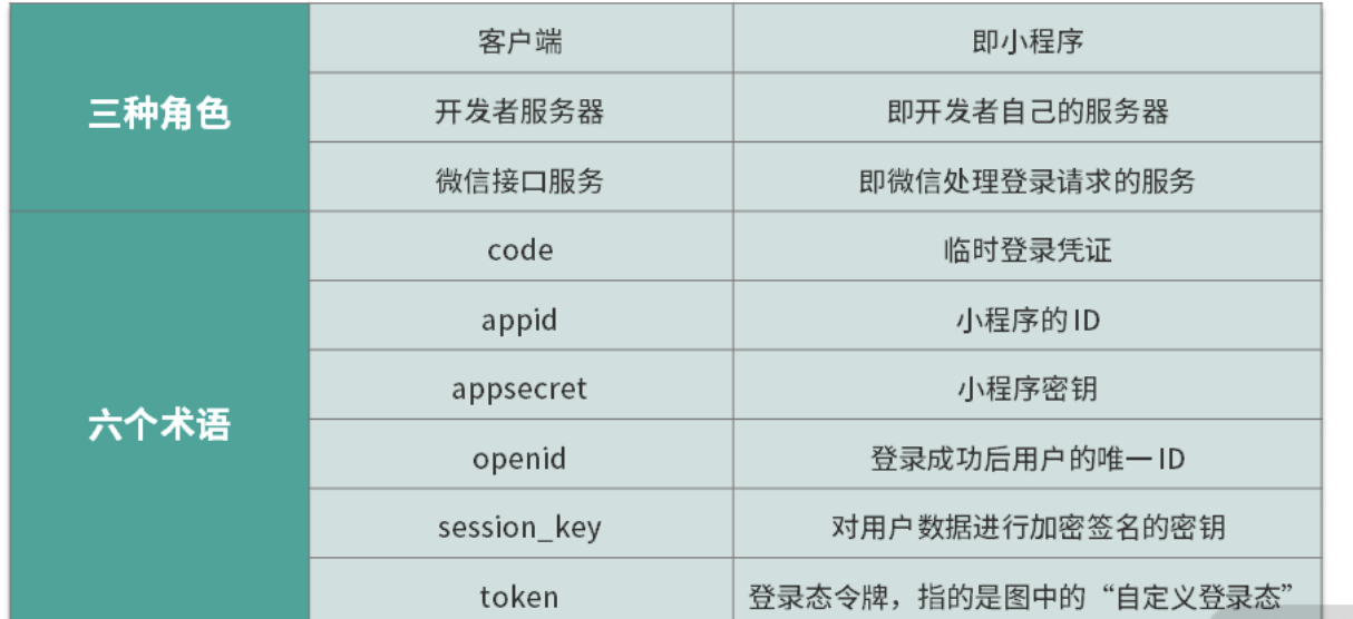 整个登录流程中描述了三种角色和六个术语,了解它们的定位和作用,是理解小程序登录流程的基础。