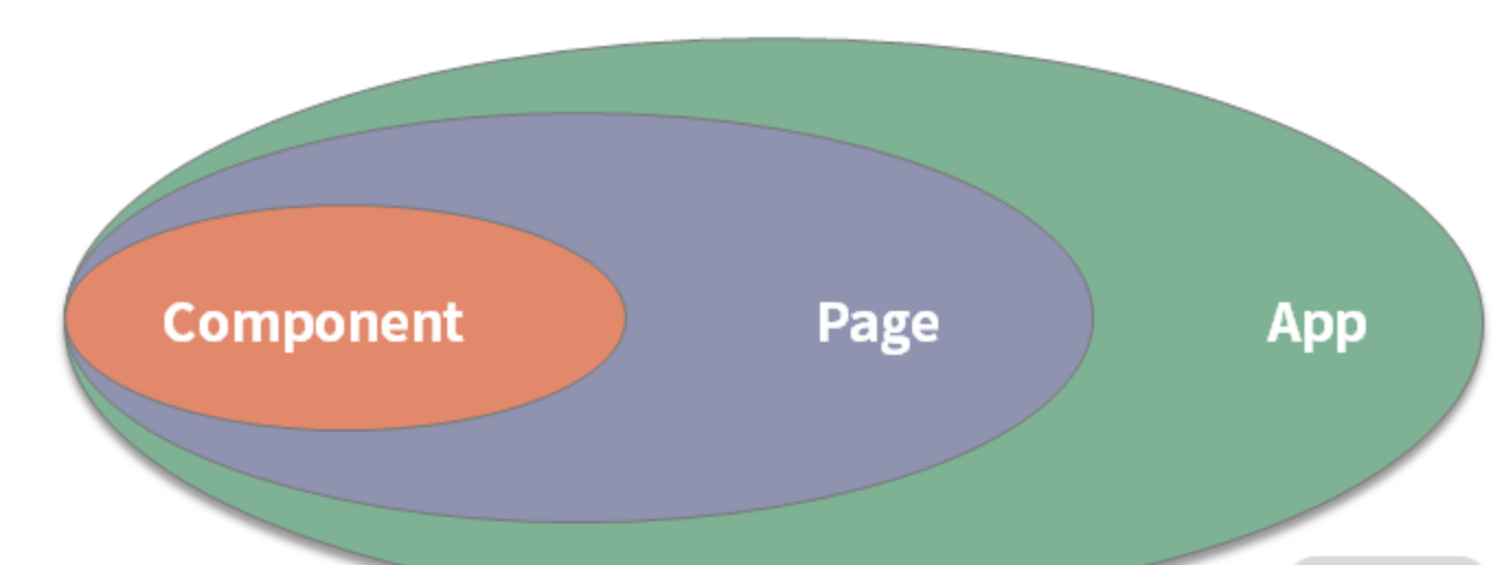 创建微信小程序自定义组件需要使用 Component 构造器,这是微信小程序结构体系内最小粒度的构造器,外层是 Page 构造器,最外层的是 App 构造器,三者的关系如下图: