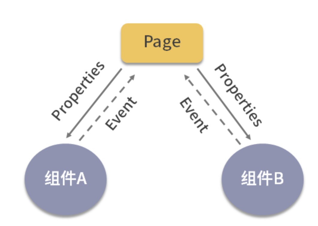 当组件 A 需要与组件 B 进行通信时,会抛出一个事件通知父组件 Page,父组件接收到事件之后提取事件携带的信息,然后通过 properties 传递给组件 B。这样便完成了子组件之间的消息传递。