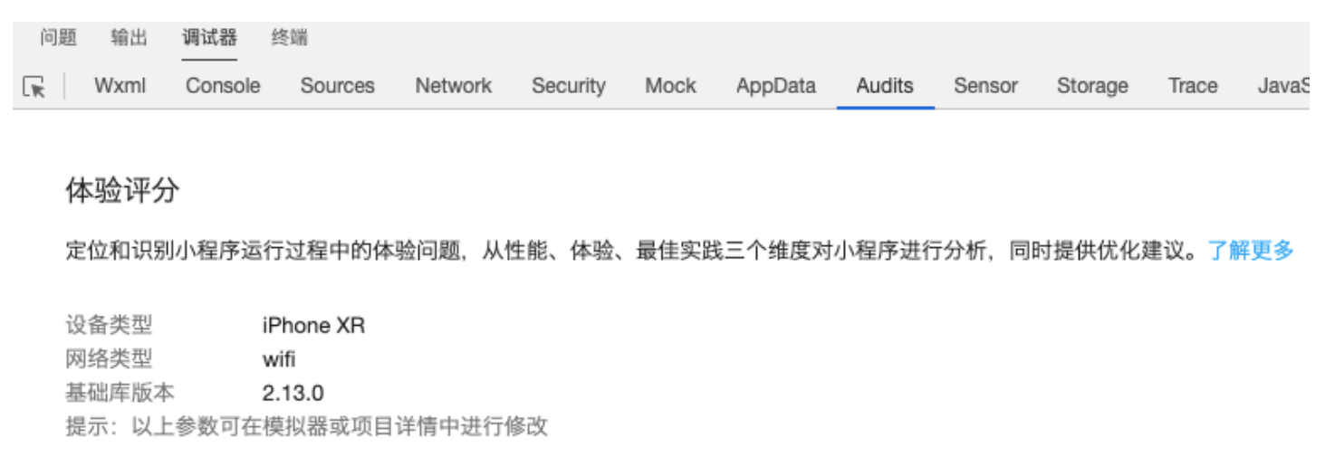 点击“运行”之后,微信 IDE 会对当前的小程序项目进行评测(包括代码层面的检测、通过记录用户交互行为的体验检测)。最终从性能、体验和最佳实践三个维度分别打分以及综合分: