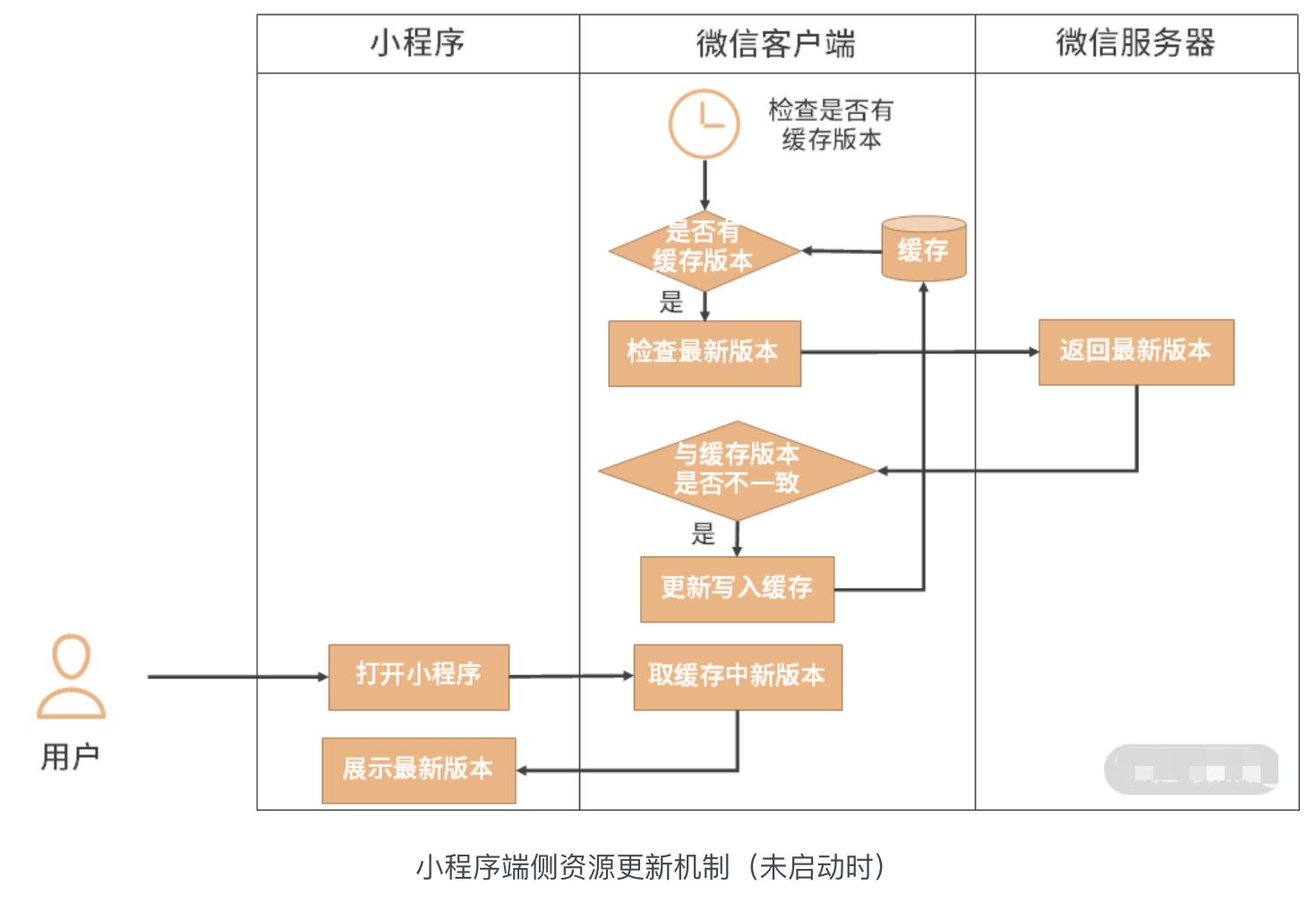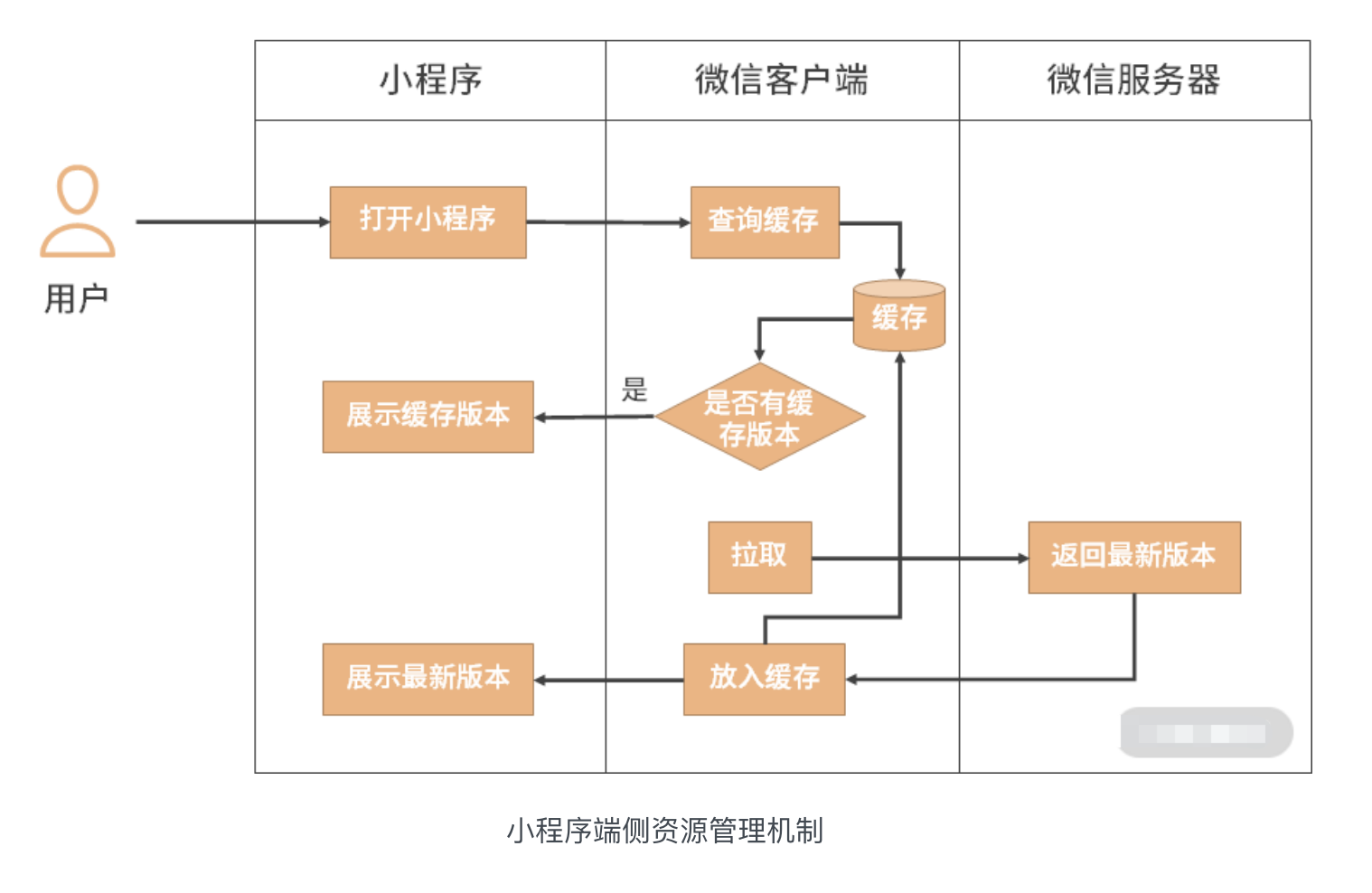 当用户打开小程序时,微信客户端会先从缓存中拉取小程序的端侧资源,有的话就展示给用户,没有的话会从微信服务器拉取,这时,拉取的肯定是最新版本,然后放入缓存并展示给用户。