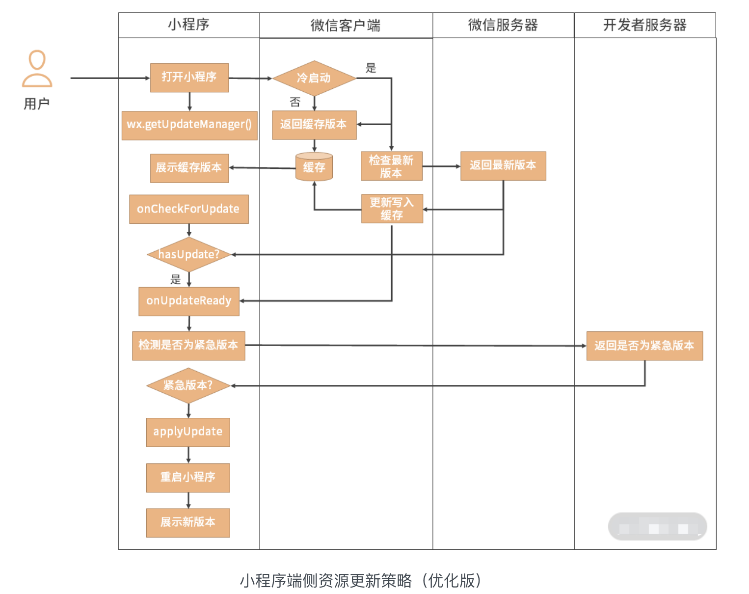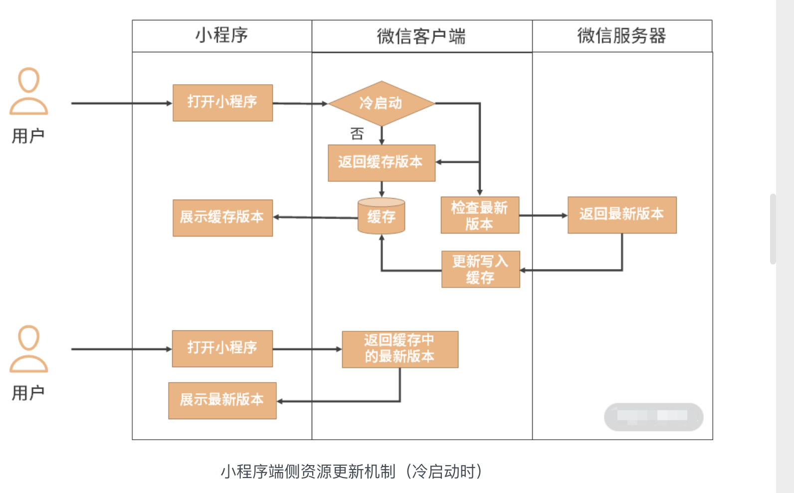 如果小程序处于冷启动状态,微信客户端会主动检查是否有新版本,同时会向用户展示缓存中的旧版本。有新版本的话会默默地拉取到本地,然后在用户再次触发小程序冷启动时展示给用户。也就是说,需要两次冷启动才能将最新版本的小程序展示给用户。整个流程如下图所示: