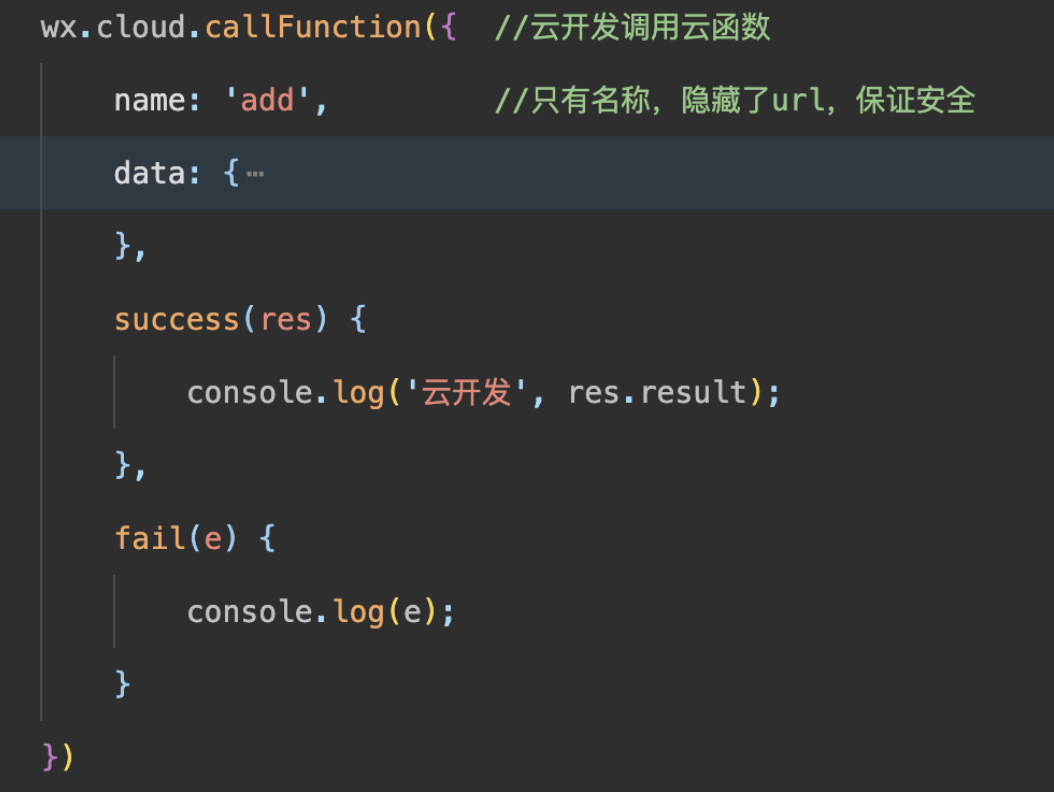 如果你想对这些数据进行一些复杂的处理(比如对数据做分析,生成报表)涉及其他的数据,可以把处理的逻辑放到云开发云函数中进行,而云函数也可以在小程序中用函数方法(function)的形式调用,举例如下: