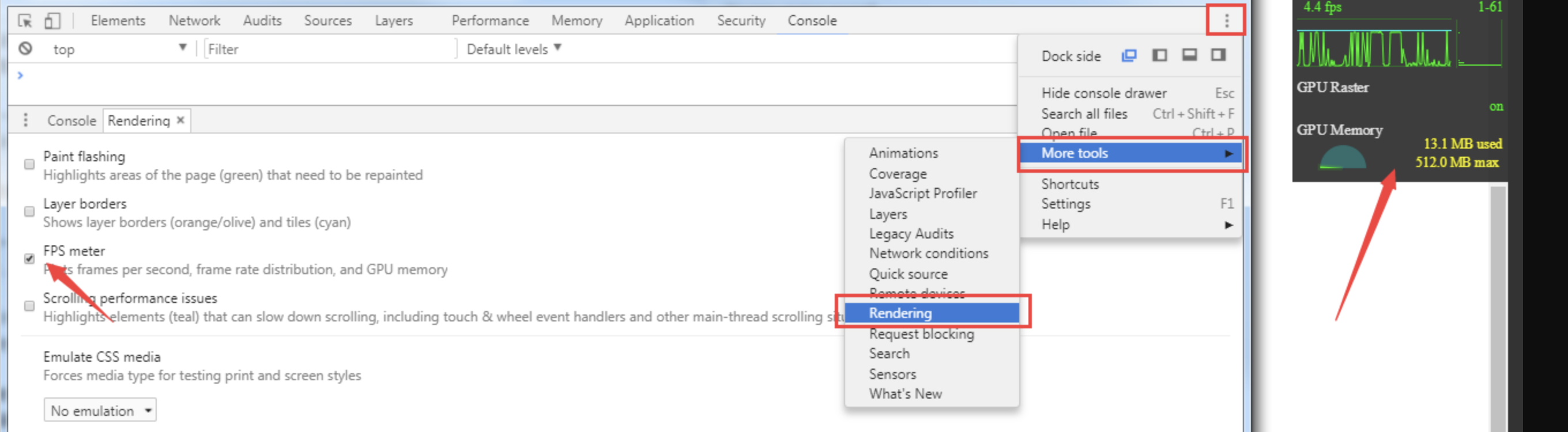Chrome提供给开发者的功能十分强大,在开发者工具中,我们进行如下选择调出FPS meter选项: