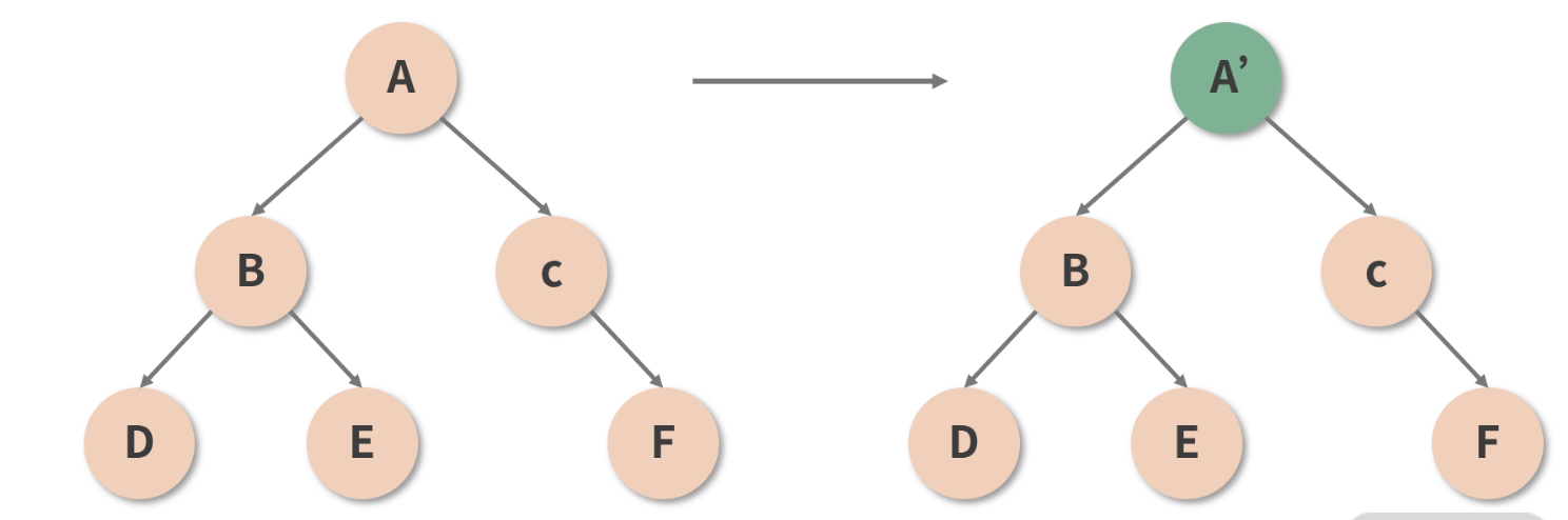 第 1 层的节点,发现两棵树的节点类型是一致的(都是 A),于是进一步Diff; - 开始对比位于