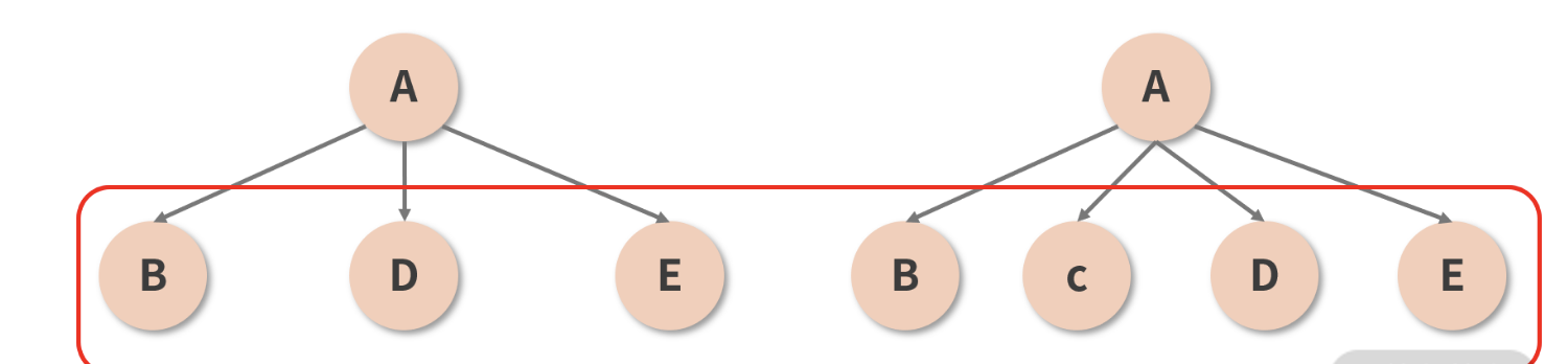 第 2 层的节点,第 1 个接受比较的是 B 这个位置,对比下来发现两棵树这个位置上的节点都是 B,没毛病,放过它; - 第 2 个接受比较的是 D 这个位置,对比 D 和 C,发现前后的类型不一致,直接删掉 D 重建 C;