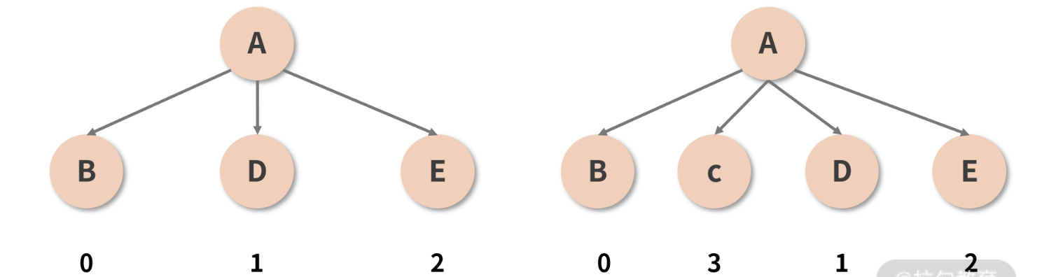 这个 key 就充当了每个节点的 ID(唯一标识),有了这个标识之后,当 C 被插入到 B 和 D 之间时,React 并不会再认为 C、D、E 这三个坑位都需要被重建——它会通过识别 ID,意识到 D 和 E 并没有发生变化(D 的 ID 仍然是 1,E 的 ID 仍然是 2),而只是被调整了顺序而已。接着,React 便能够轻松地重用它“追踪”到旧的节点,将 D 和 E 转移到新的位置,并完成对 C 的插入。这样一来,同层级下元素的操作成本便大大降低。
