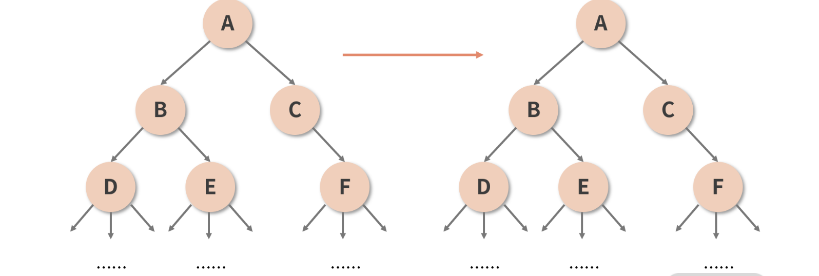 拿这棵树来举例,若 A 组件发生了更新,那么栈调和的工作过程是这样的:对比第 1 层的两个 A,确认节点可复用,继续 Diff 其子组件。当 Diff 到 B 的时候,对比前后的两个 B 节点,发现可复用,于是继续 Diff 其子节点 D、E。待 B 树最深层的 Diff 完成、逐层回溯后,再进入 C 节点的 Diff 逻辑......调和器会重复“父组件调用子组件”的过程,直到最深的一层节点更新完毕,才慢慢向上返回。