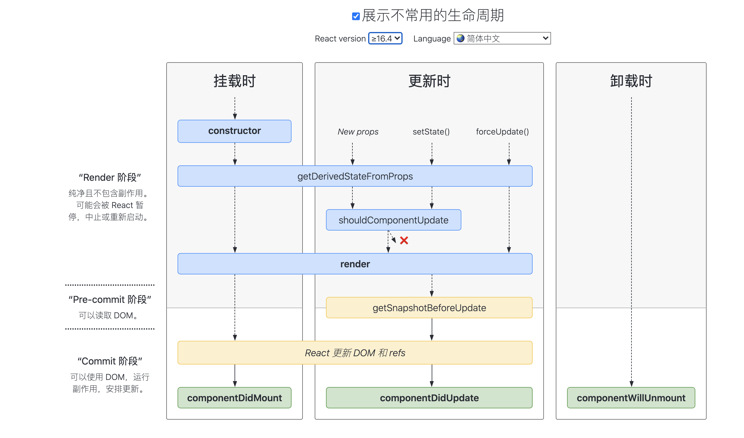 其中 shouldComponentUpdate 的作用是通过返回 true 或者 false,来帮助我们判断更新的必要性,一般在这个函数中不会进行副作用操作,因此风险不大
