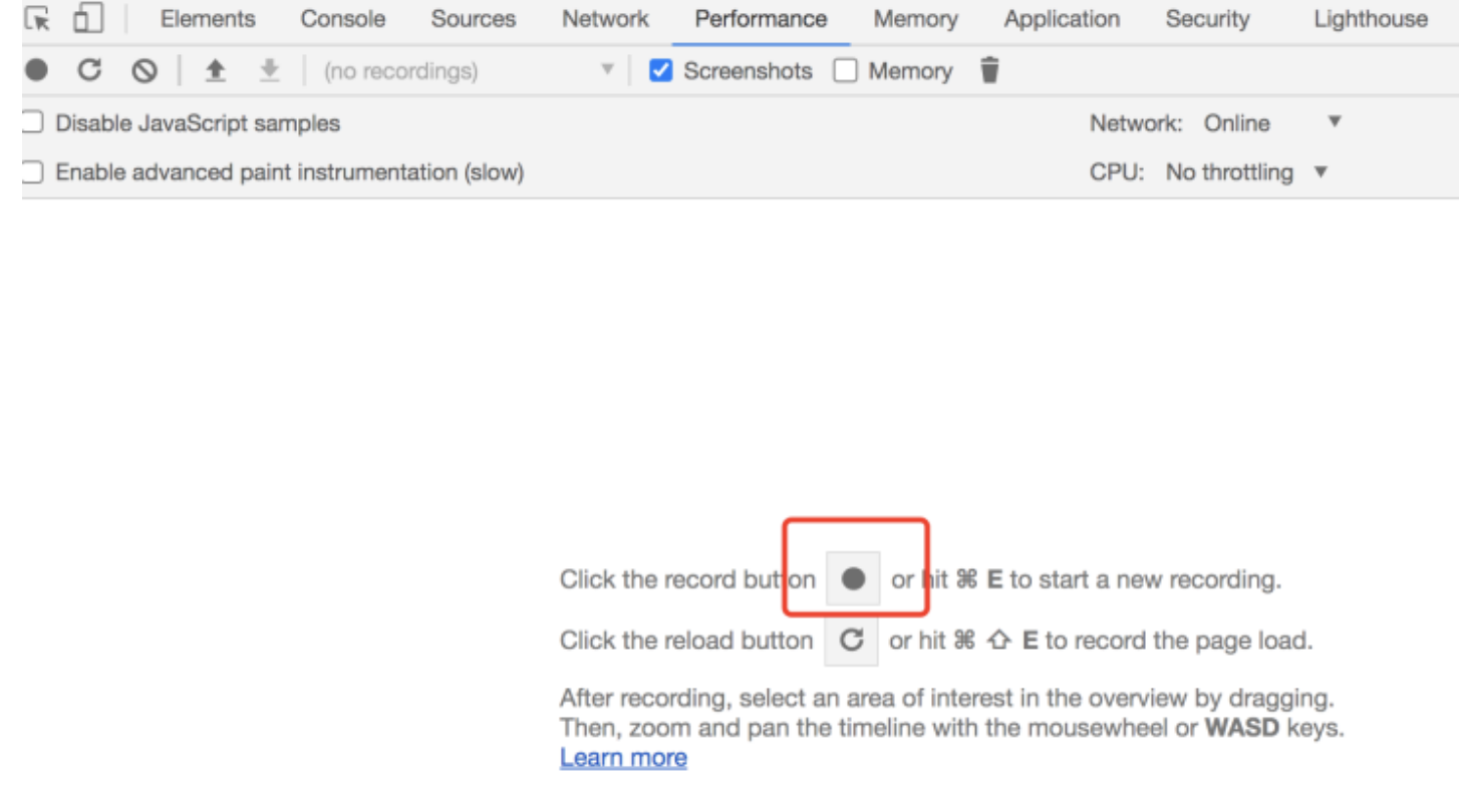 现在请你打开 Chrome 的 Performance 面板,点击下图红色圈圈所圈住的这个“记录”按钮: