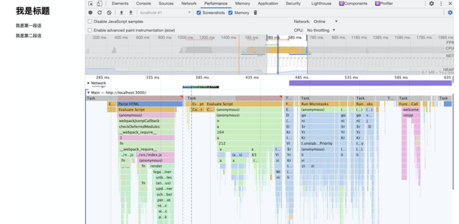 然后重新访问 Demo 页面对应的本地服务地址,待页面刷新后,终止记录,便能够得到如下图右下角所示的这样一个调用栈大图: