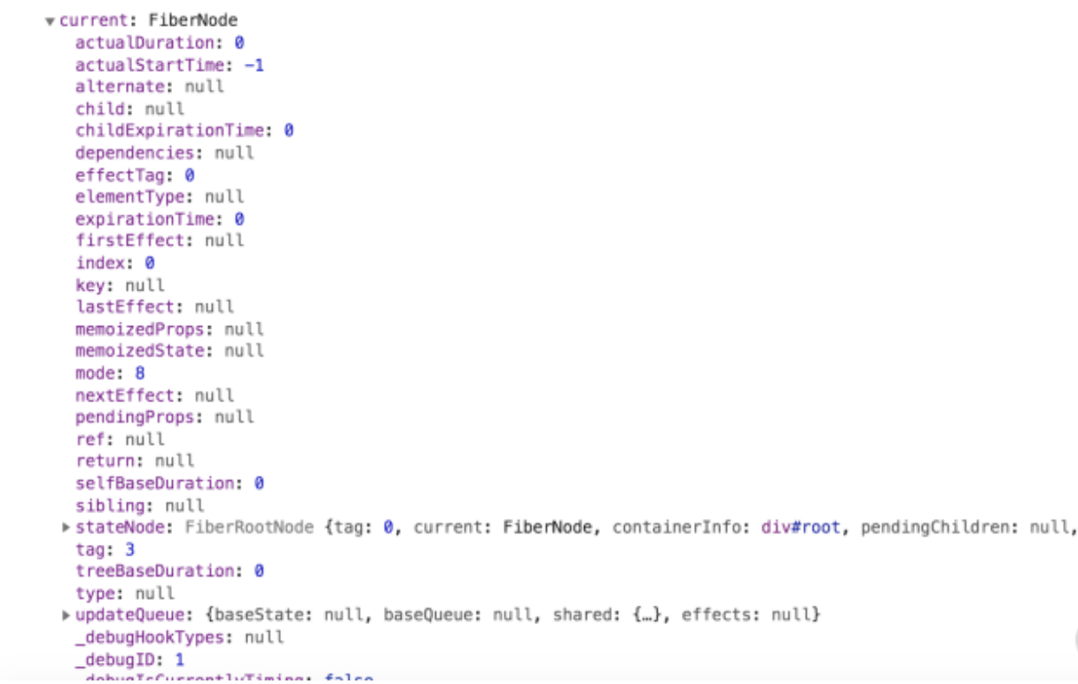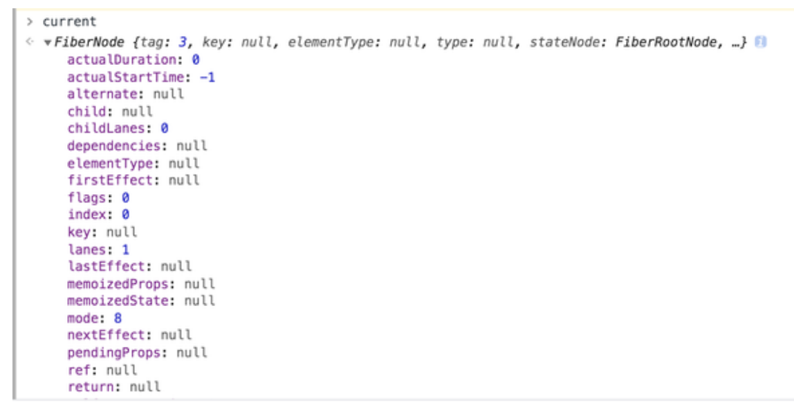 可以看出,root 对象(container._reactRootContainer)上有一个 _internalRoot 属性,这个 _internalRoot 也就是 fiberRoot。fiberRoot 的本质是一个 FiberRootNode 对象,其中包含一个 current 属性,该属性同样需要划重点。这里我为你高亮出 current 属性的部分内容:
