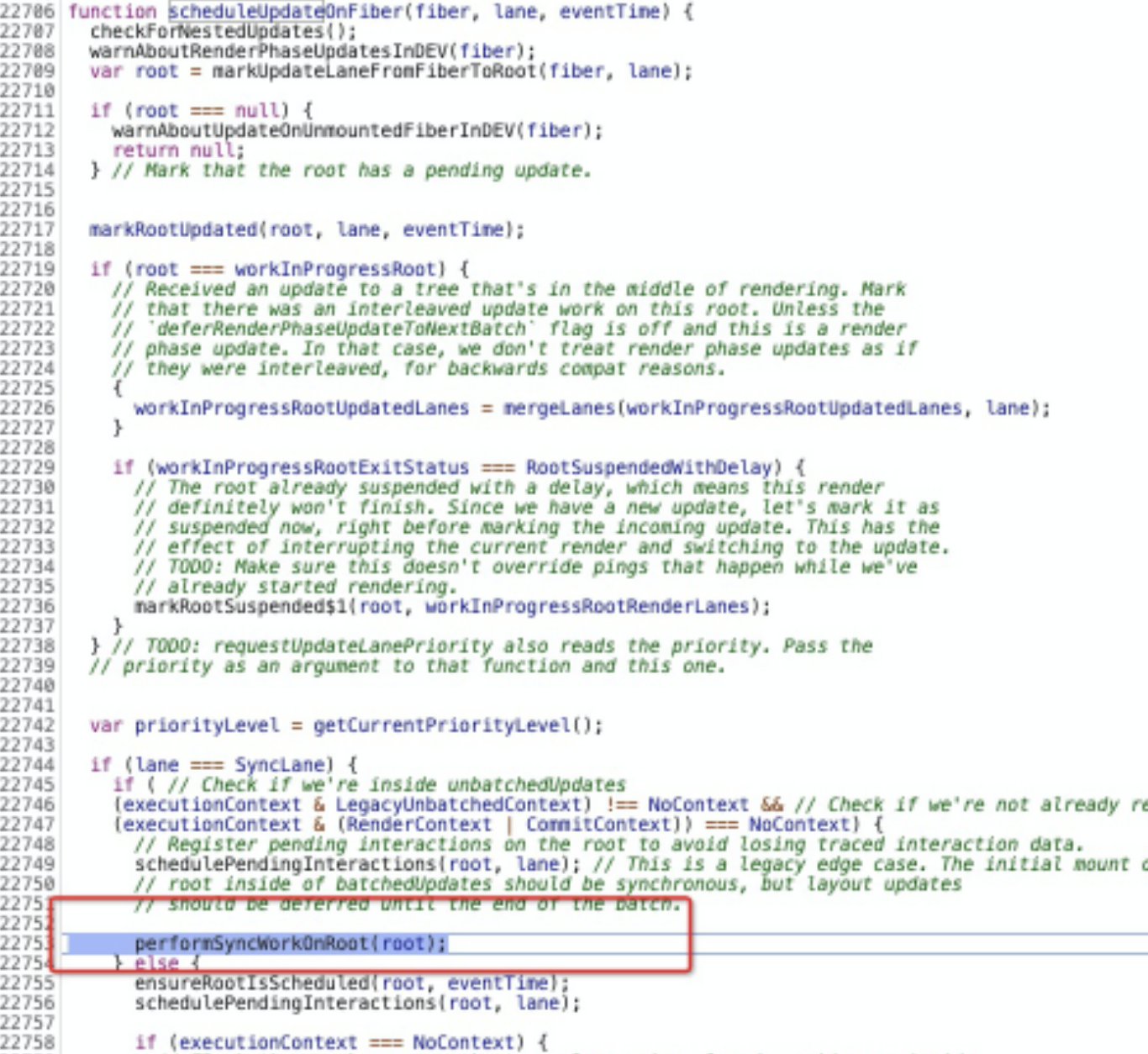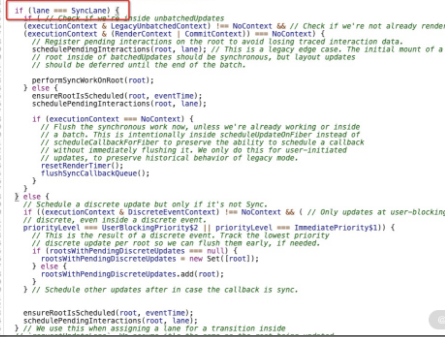 接下来我们很有必要去看看 updateContainer 里面的逻辑。这里我将主体代码提取如下(解析在注释里,如果没有耐心读完可以直接看文字解读):