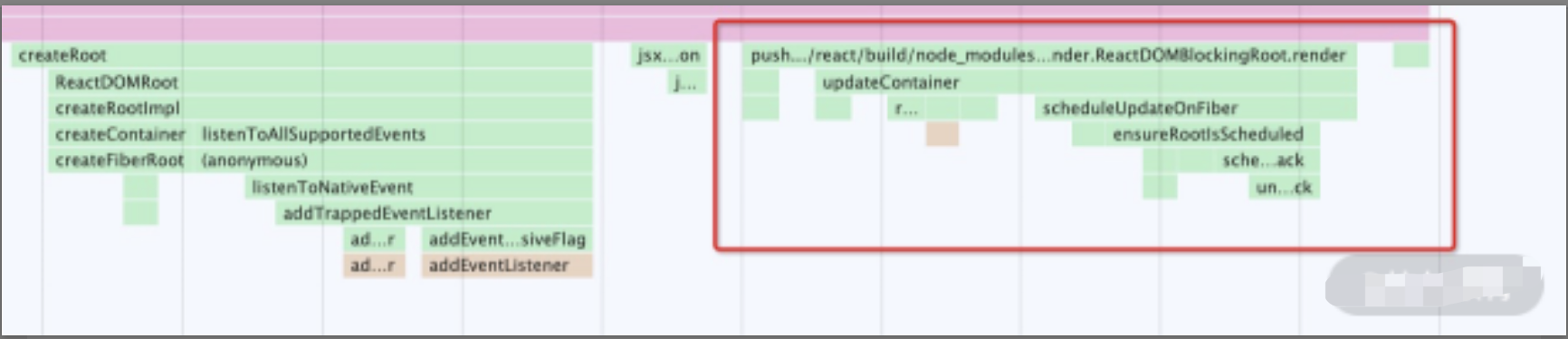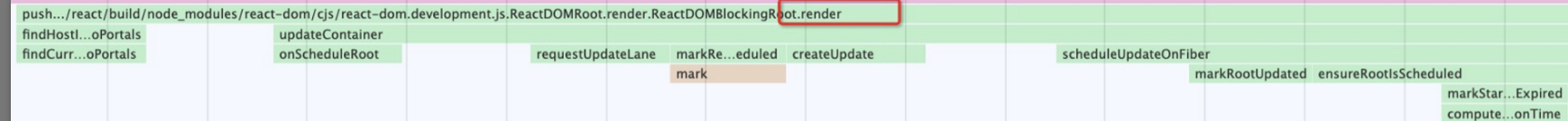 放大该图,定位“src/index.js”这个文件路径,我们就可以找到 ReactDOM.render 方法对应的调用栈,如下图所示: