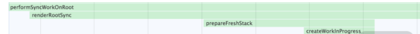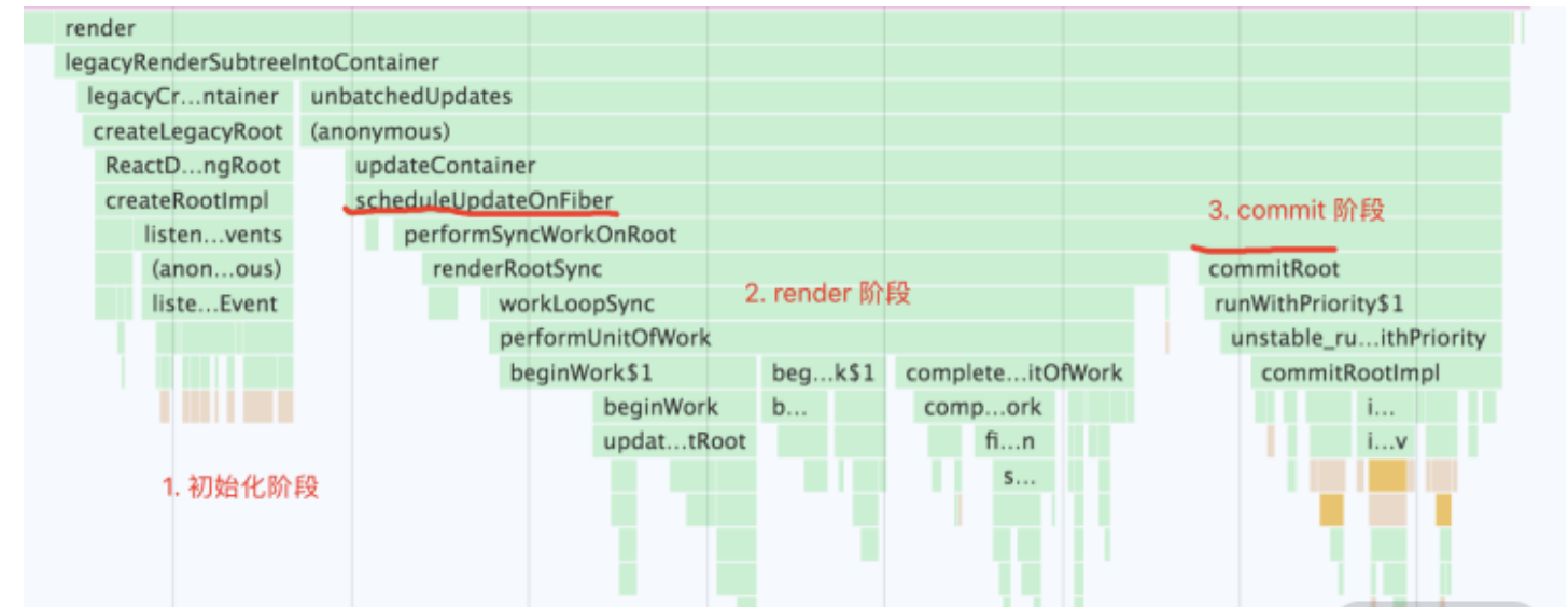 图中 scheduleUpdateOnFiber 方法的作用是调度更新,在由 ReactDOM.render 发起的首屏渲染这个场景下,它触发的就是 performSyncWorkOnRoot。performSyncWorkOnRoot 开启的正是我们反复强调的 render 阶段;而 commitRoot 方法开启的则是真实 DOM 的渲染过程(commit 阶段)。因此以 scheduleUpdateOnFiber 和 commitRoot 两个方法为界,我们可以大致把 ReactDOM.render 的调用栈划分为三个阶段: