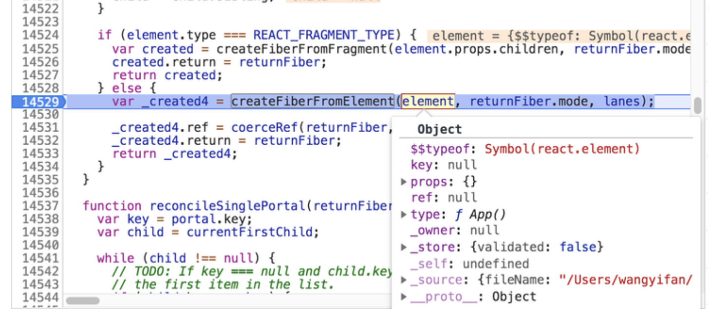 考虑到 current 属性对应的 FiberNode 节点,在调用栈中实际是由 createHostRootFiber 方法创建的,React 源码中也有多处以 rootFiber 代指 current 对象,因此下文中我们将以 rootFiber 指代 current 对象。