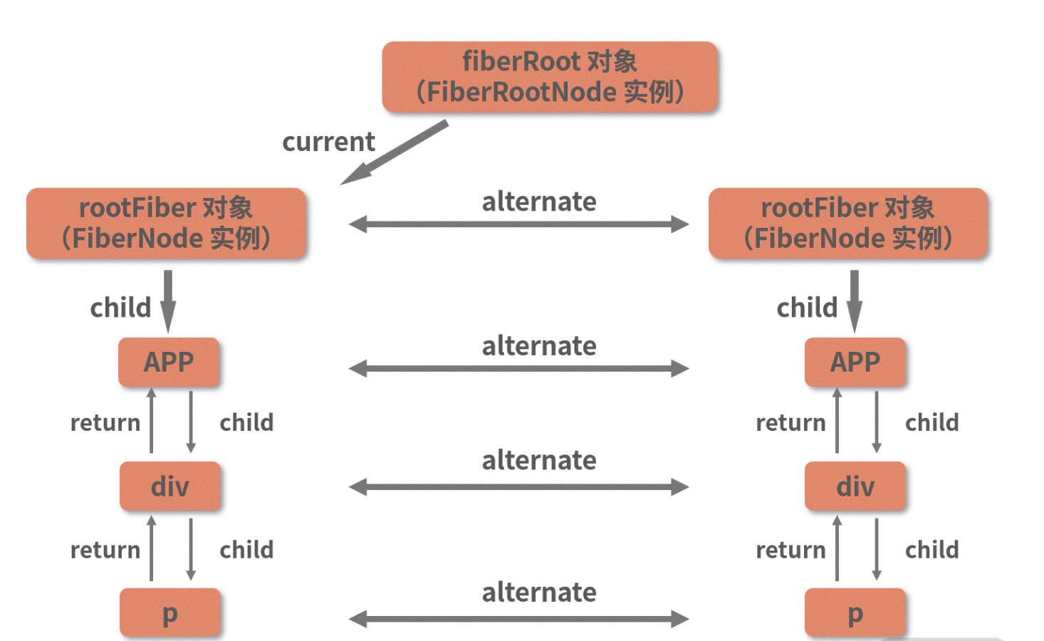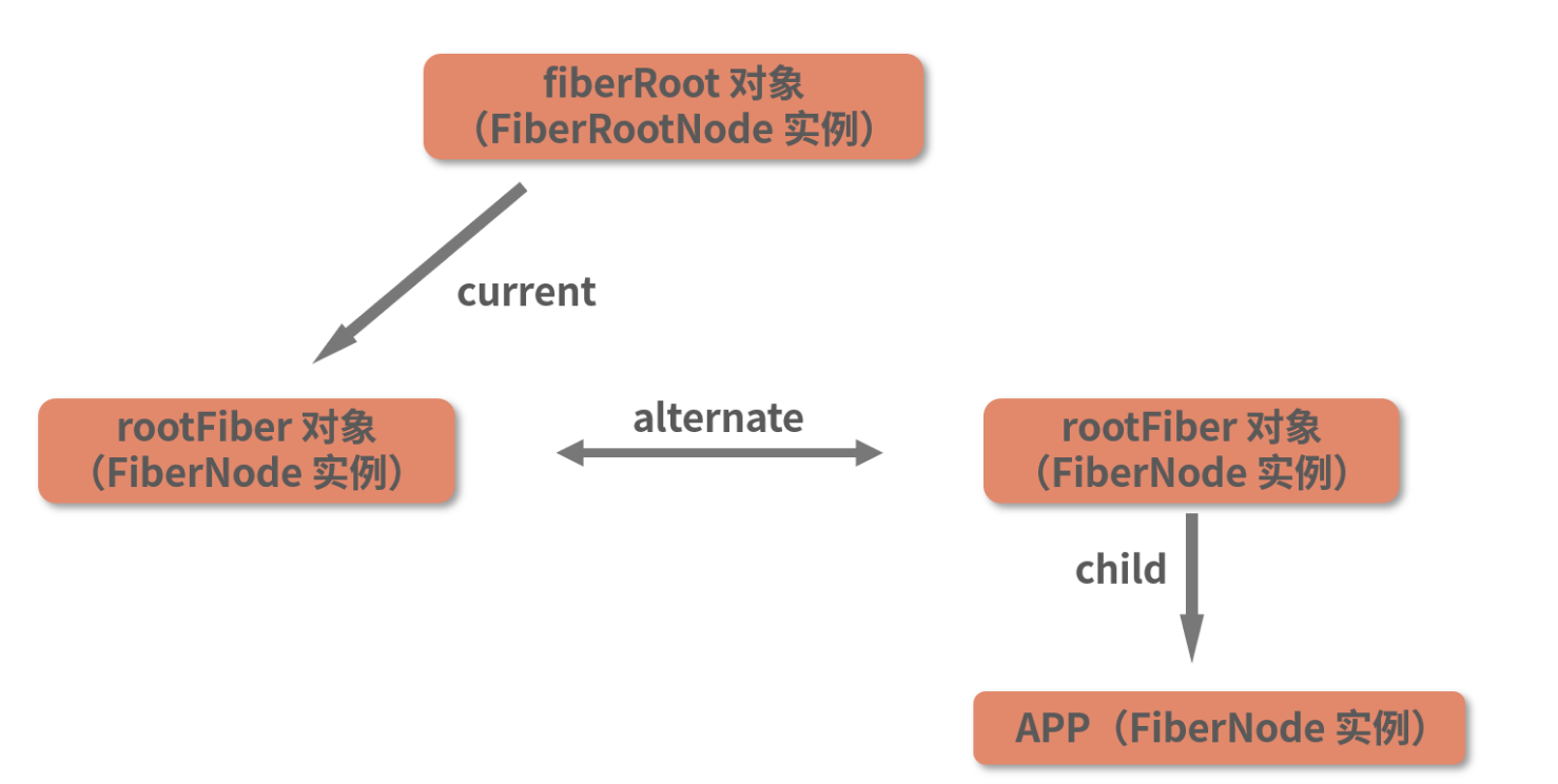 其中,fiberRoot 的关联对象是真实 DOM 的容器节点;而 rootFiber 则作为虚拟 DOM 的根节点存在。这两个节点,将是后续整棵 Fiber 树构建的起点。