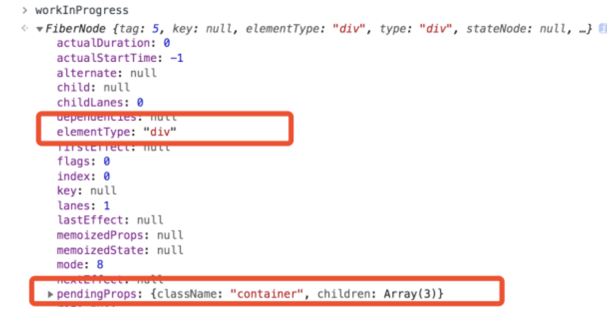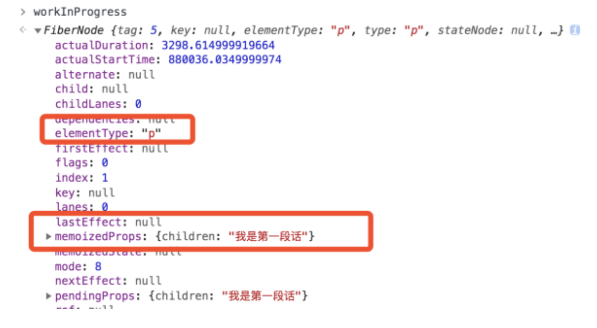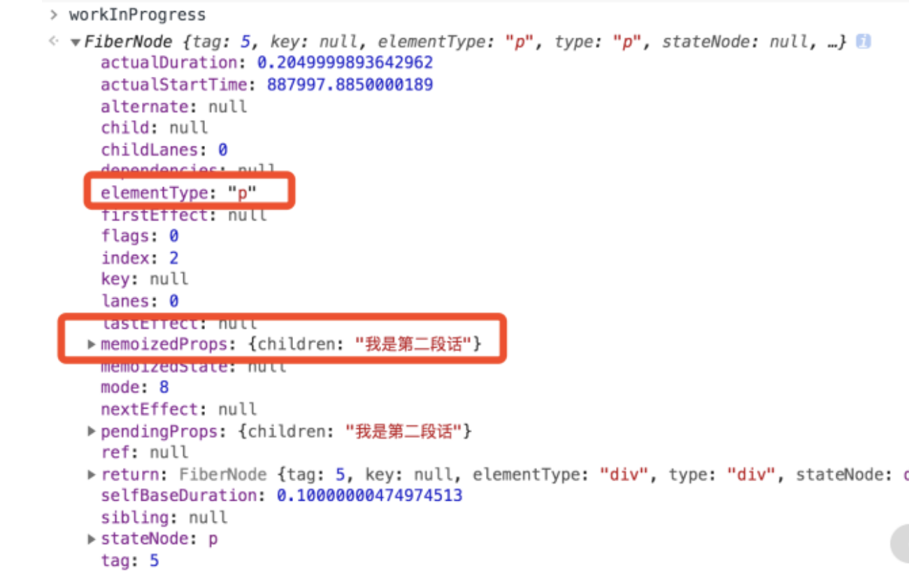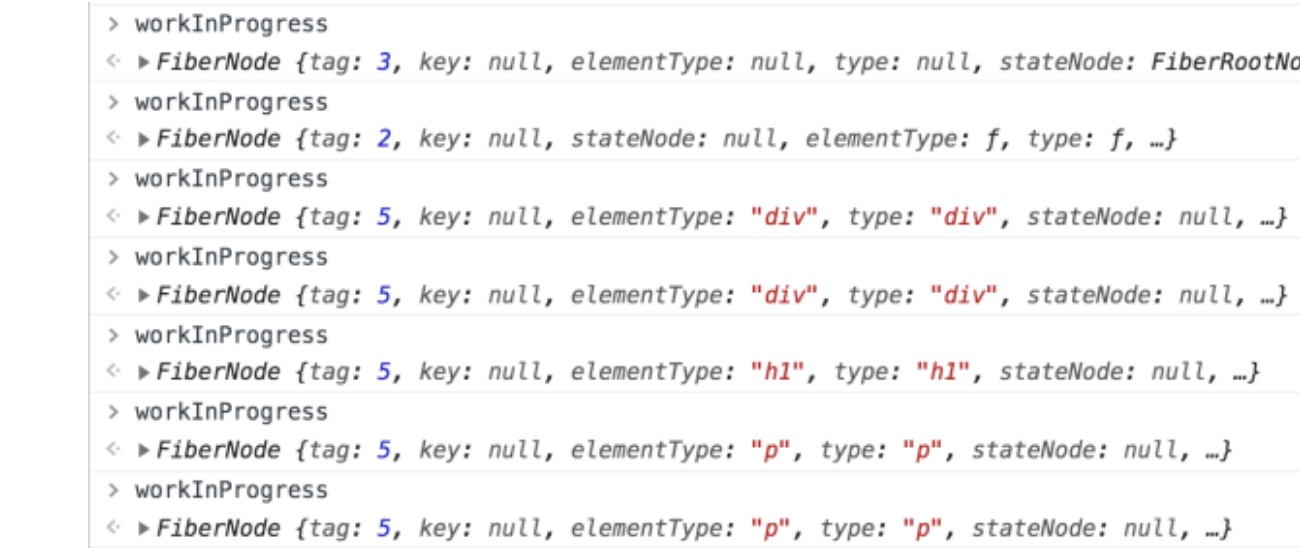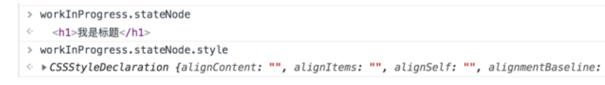 - 创建好的 DOM 节点会被赋值给 workInProgress 节点的 stateNode 属性。也就是说当我们想要定位一个 Fiber 对应的 DOM 节点时,访问它的 stateNode 属性就可以了。这里我们可以尝试访问运行时的 h1 节点的 stateNode 属性,结果如下图所示: