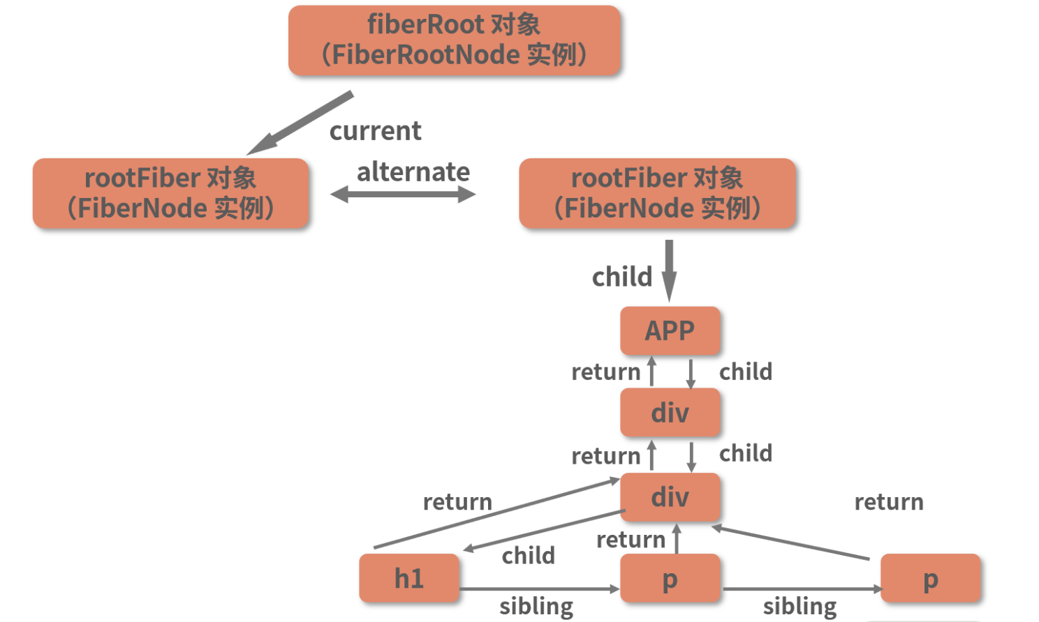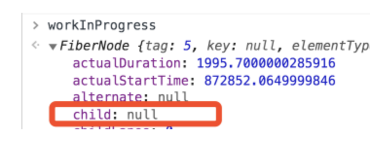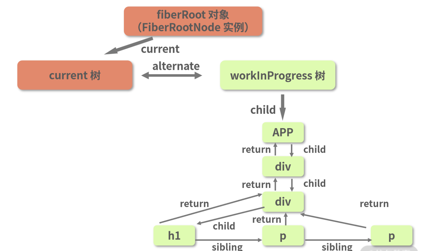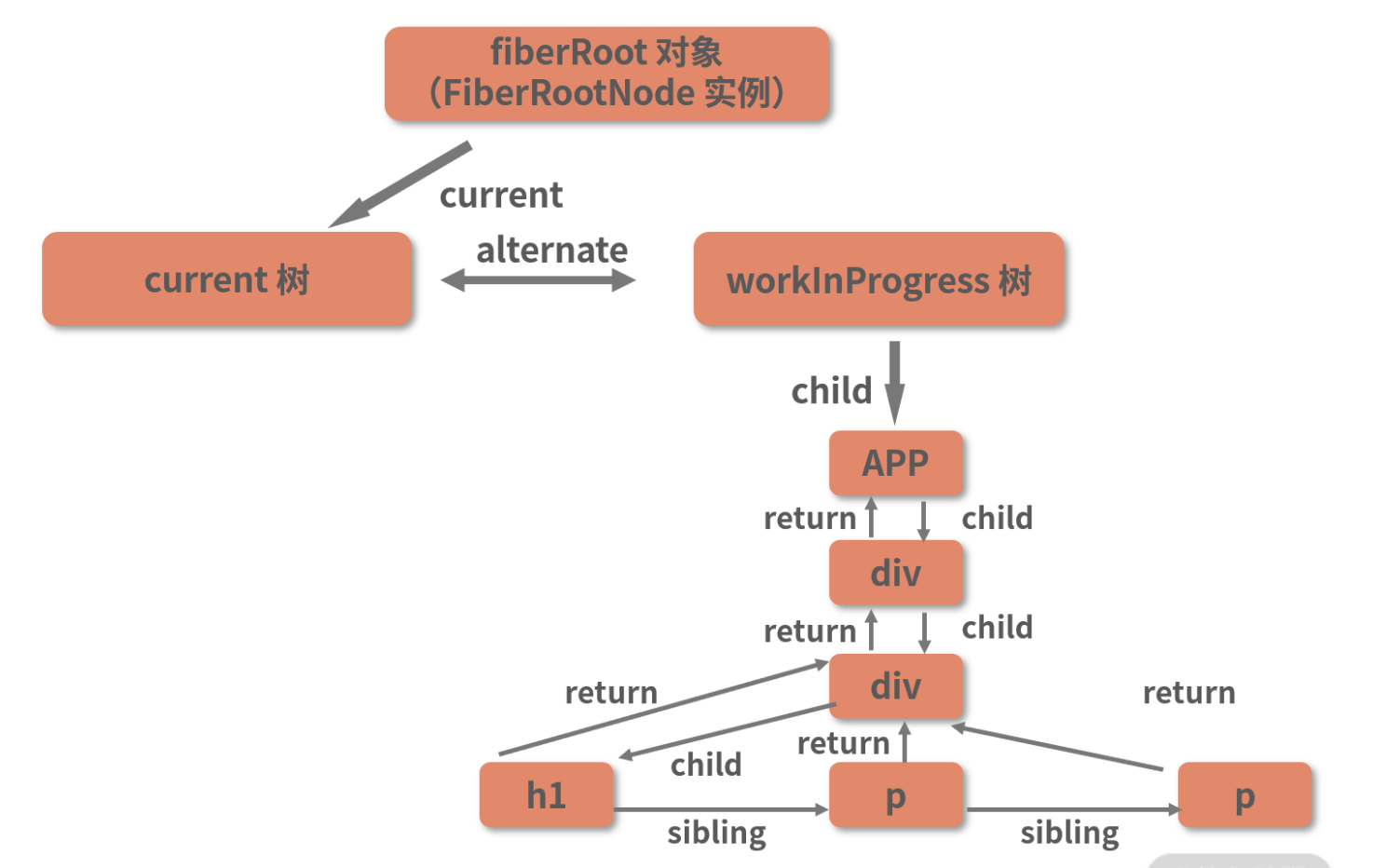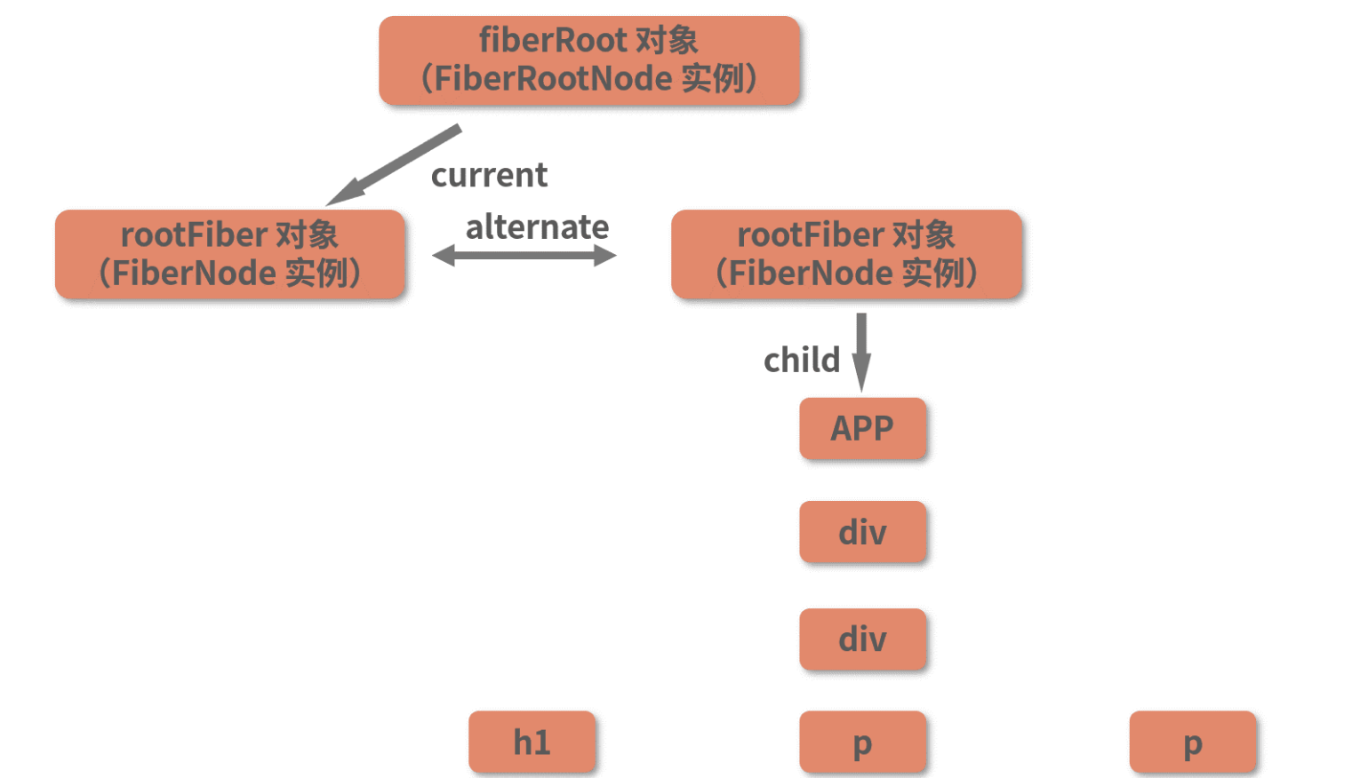 workInProgress 节点和 current 节点之间用 alternate 属性相互连接。在组件的挂载阶段,current 树只有一个 rootFiber 节点,并没有其他内容。因此 h1 这个 workInProgress 节点对应的 current 节点是 null。