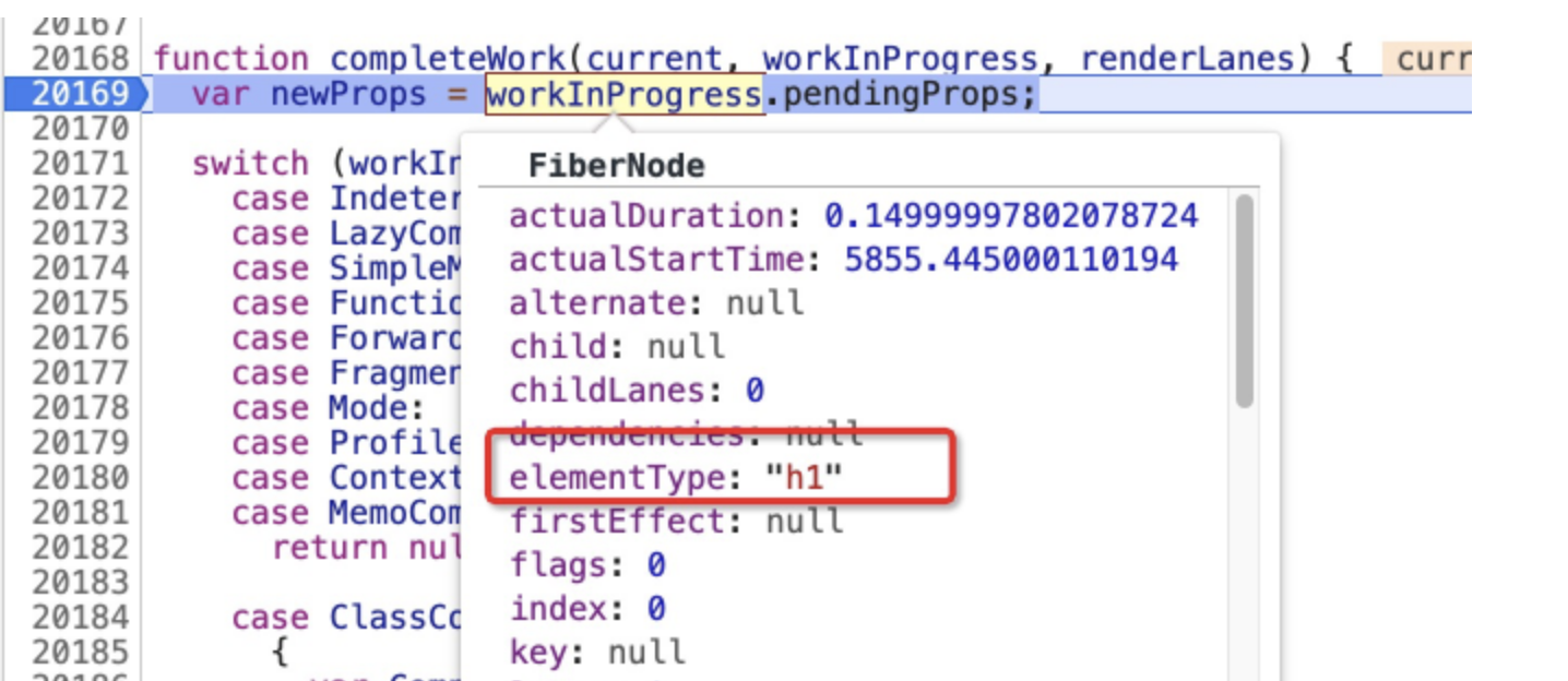 completeWork的核心逻辑是一段体量巨大的switch语句,在这段switch语句中,completeWork将根据workInProgress节点的tag属性的不同,进入不同的DOM节点的创建、处理逻辑。- 在 Demo 示例中,h1 节点的 tag 属性对应的类型应该是 HostComponent,也就是“原生 DOM 元素类型”。