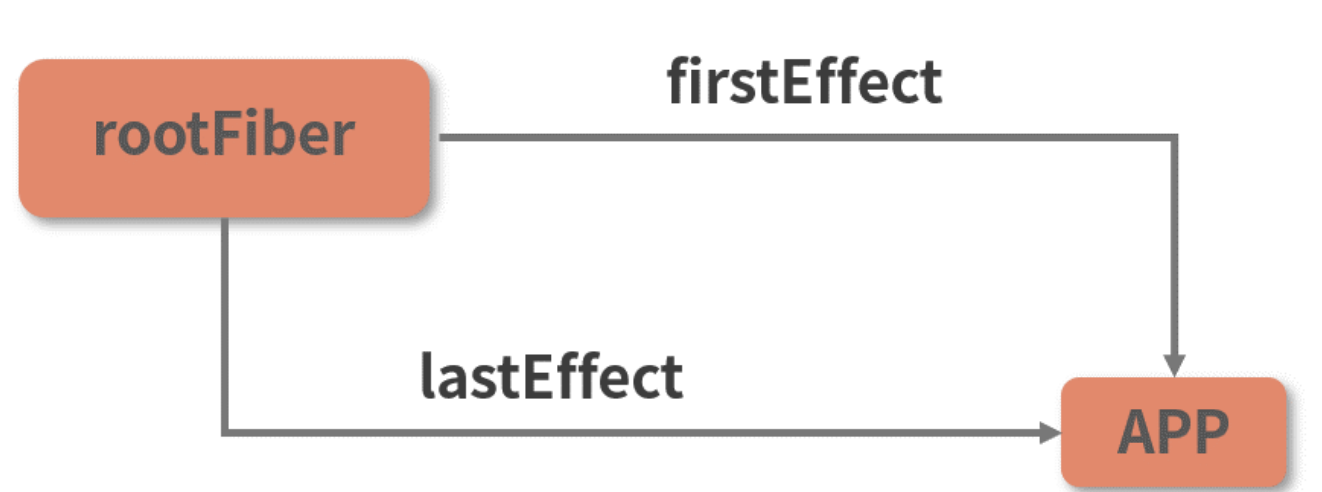 - rootFiber 的 firstEffect 和 lastEffect 指针都会指向 App 节点,App 节点由此成为 effectList 中的唯一一个 FiberNode,如下图所示。