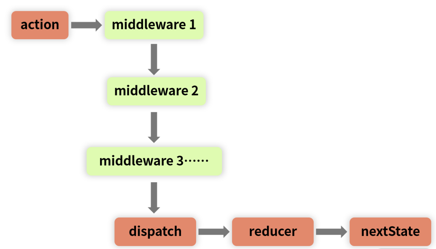 若有多个中间件,那么 Redux 会结合它们被“安装”的先后顺序,依序调用这些中间件,这个过程如下图所示: