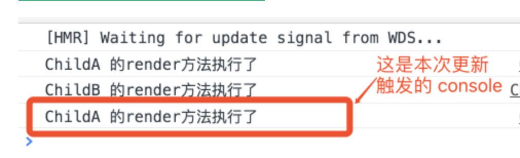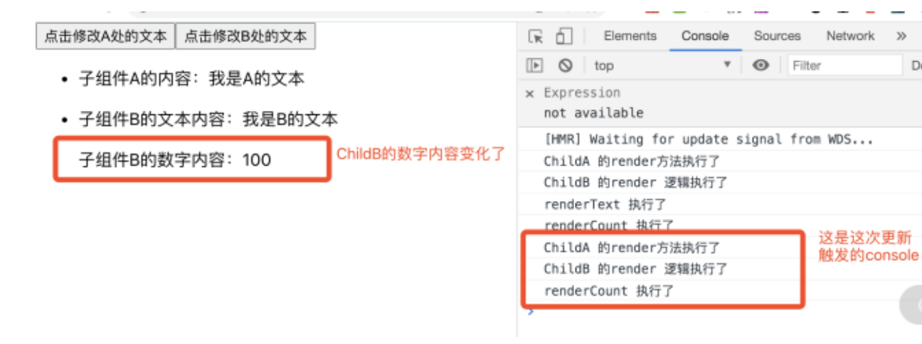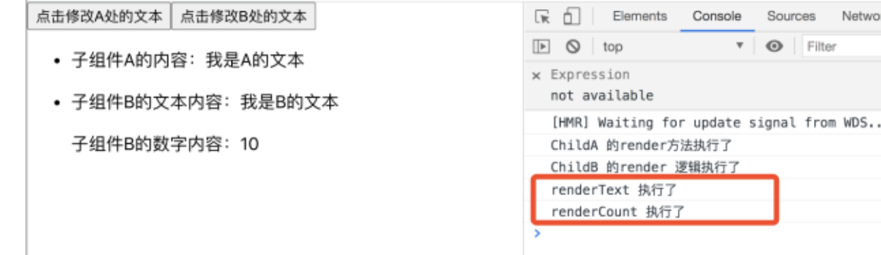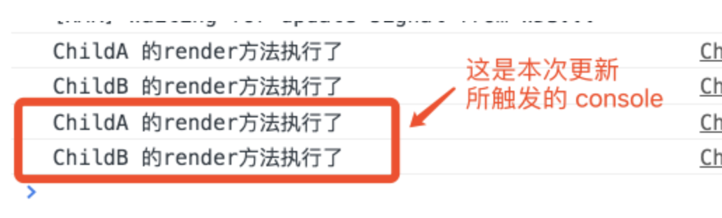这样的输出结果告诉我们,在刚刚的点击动作后,不仅 ChildA 的 re-render 被触发了,ChildB 的 re-render 也被触发了。