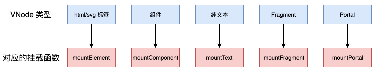 mount 函数的作用是把一个 VNode 渲染成真实 DOM,根据不同类型的 VNode 需要采用不同的挂载方式,如下: