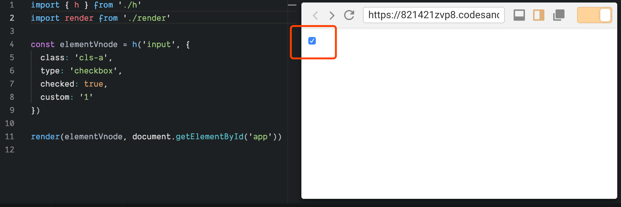 我们来测试一下我们的代码,假设我们要渲染的 VNode 如下: