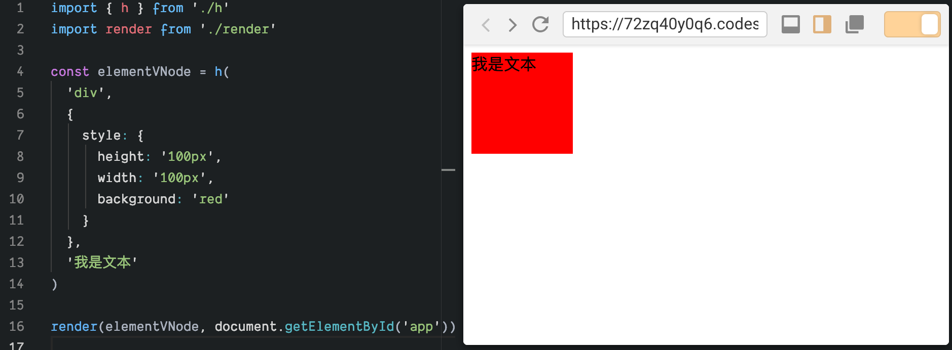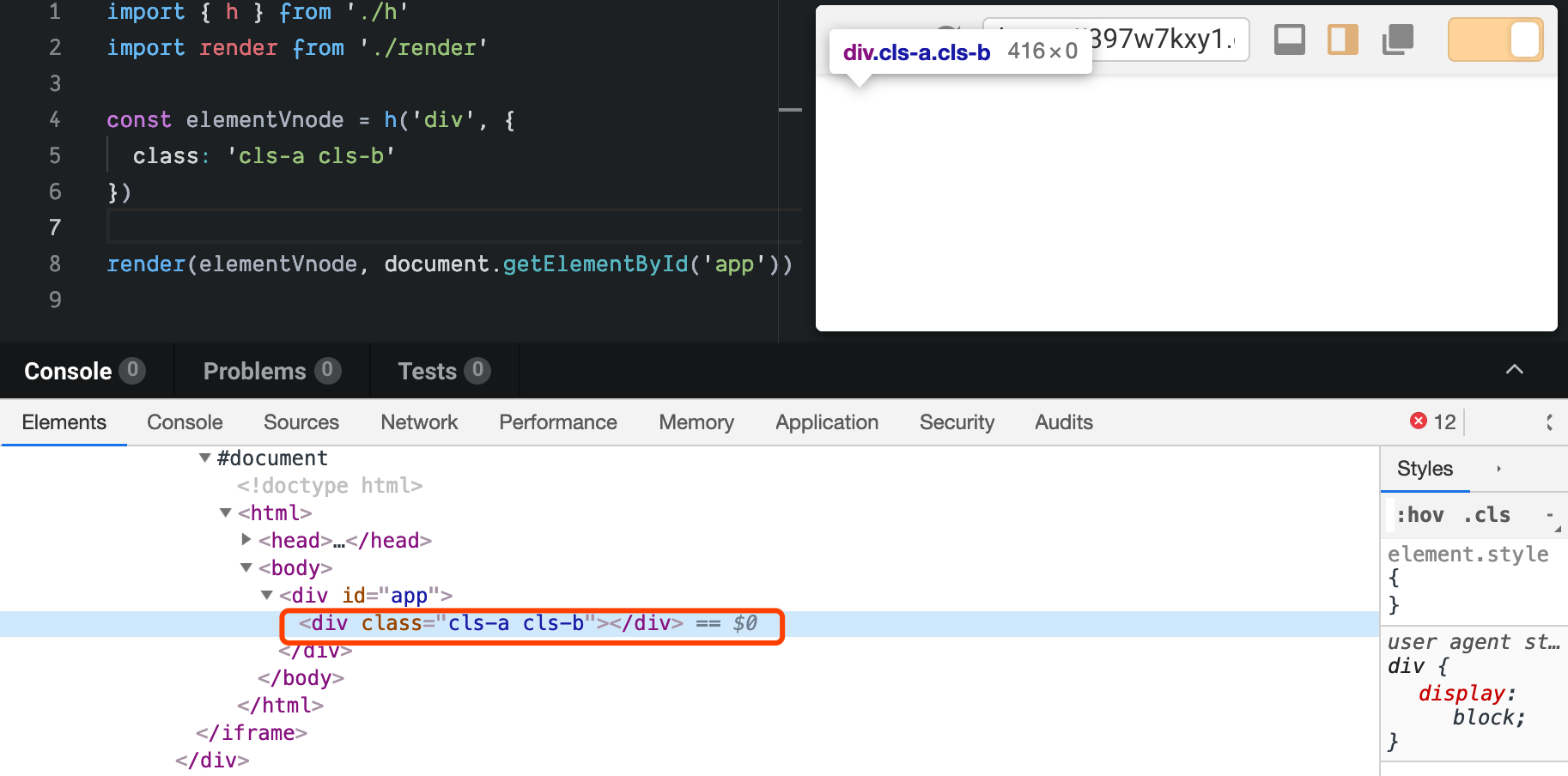使用渲染器渲染该 elementVNode 的效果图如下: