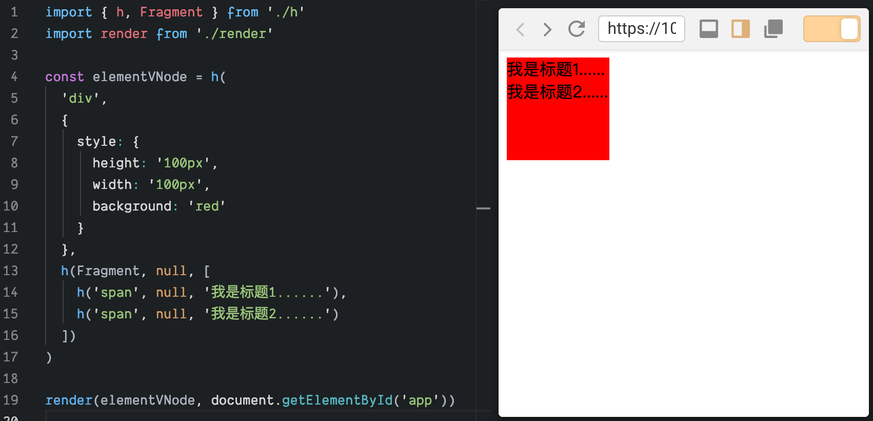 为了测试我们的代码,我们修改 elementVNode 如下: