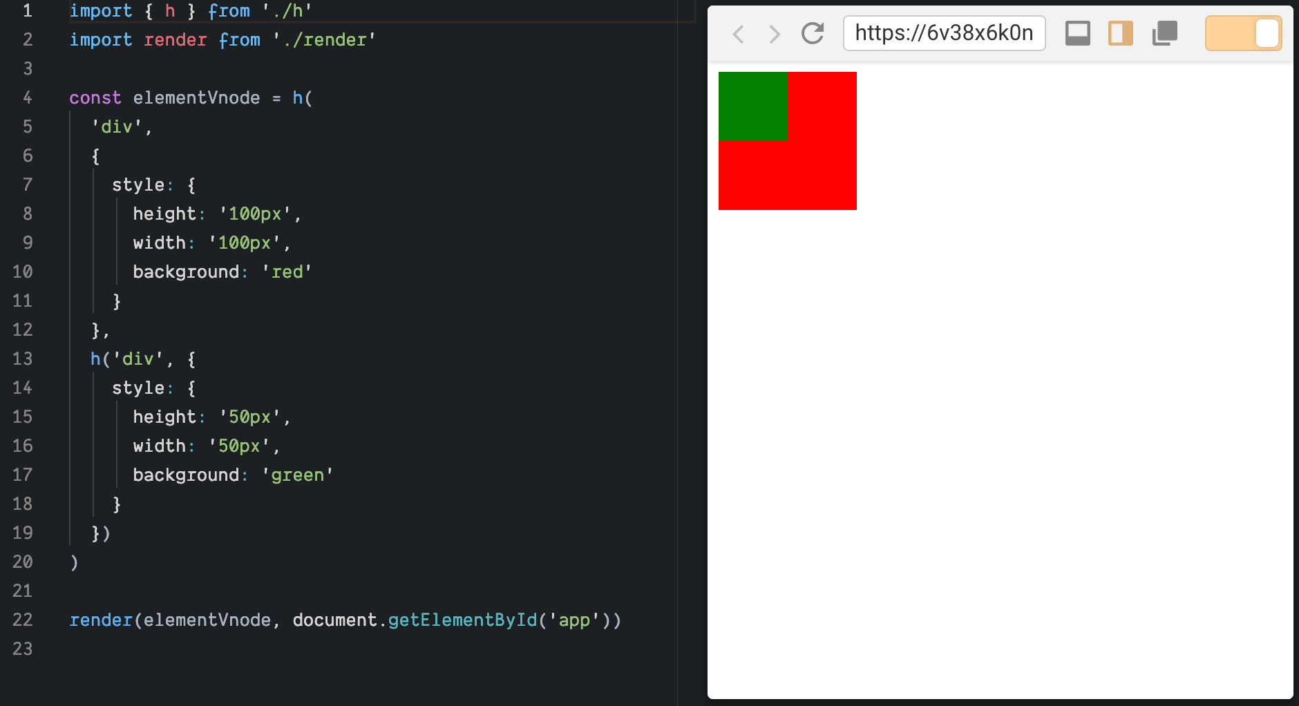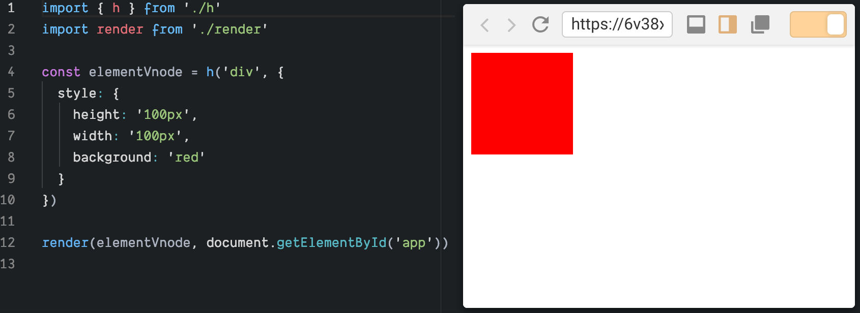 如上代码所示,在创建真实DOM之后,我们需要检查 VNodeData 是否存在,如果 VNodeData 存在则遍历之。由于 VNodeData 中不仅仅包含内联样式的描述(即 style),还可能包含其他描述如 class、事件等等,所以我们使用 switch...case 语句对不同的 key 值做区分处理,以 style 为例,我们只需要将 data.style 中的样式规则应用到真实DOM即可。使用渲染器渲染 elementVNode 的效果如下: