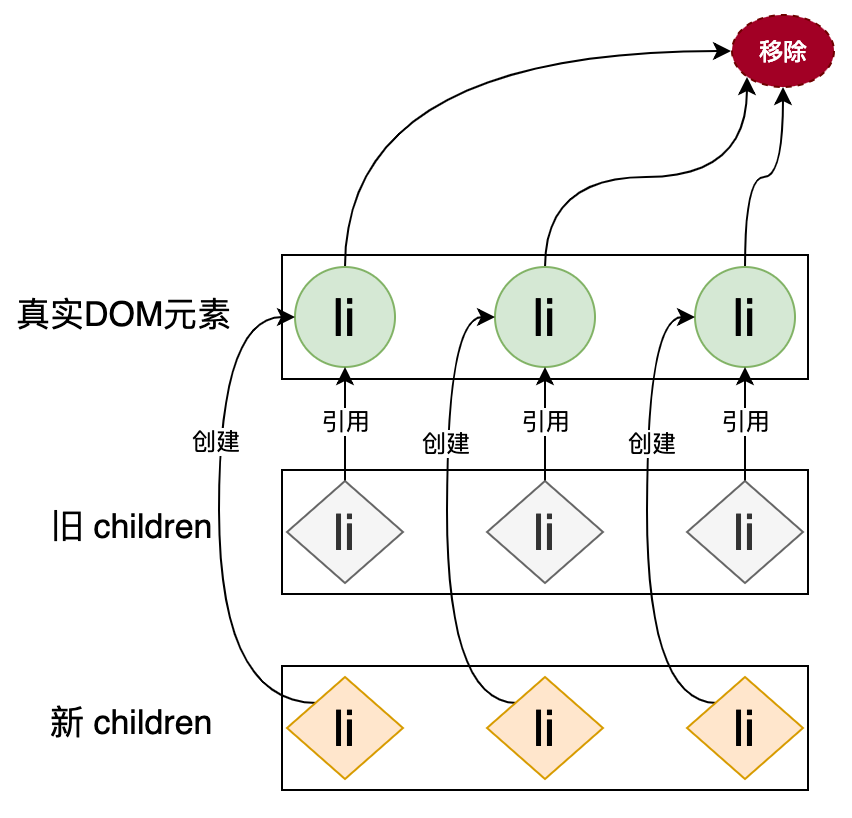 当新的 children 比旧的 children 的长度要长时,多出来的子节点是没办法应用 patch 函数的,此时我们应该把多出来的子节点作为新的节点添加上去。类似的,如果新的 children 比旧的 children 的长度要短时,我们应该把旧的 children 中多出来的子节点移除,如下图所示: