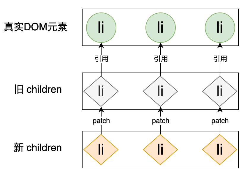 在这个过程中我们能够注意到:更新前后的真实 DOM 元素都是 li 标签。那么可不可以复用 li 标签呢?这样就能减少“移除”和“新建” DOM 元素带来的性能开销,实际上是可以的,我们在讲解 pathcElement 函数时了解到,当新旧 VNode 所描述的是相同标签时,那么这两个 VNode 之间的差异就仅存在于 VNodeData 和 children 上,所以我们完全可以通过遍历新旧 VNode,并一一比对它们,这样对于任何一个 DOM 元素来说,由于它们都是相同的标签,所以更新的过程是不会“移除”和“新建”任何 DOM 元素的,而是复用已有 DOM 元素,需要更新的只有 VNodeData 和 children。优化后的更新操作可以用下图表示: