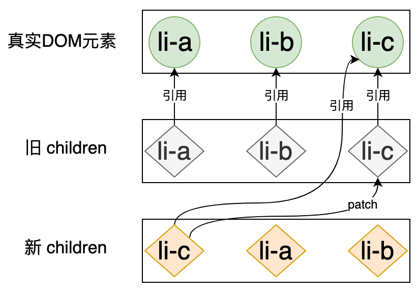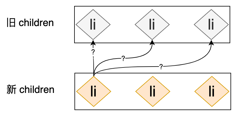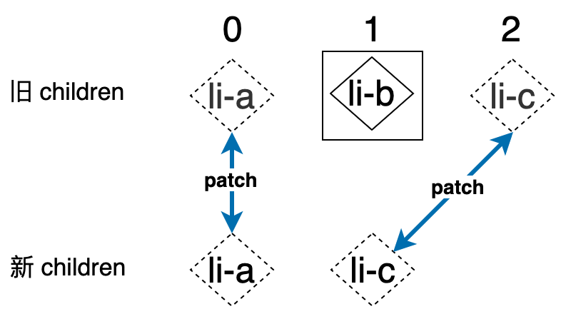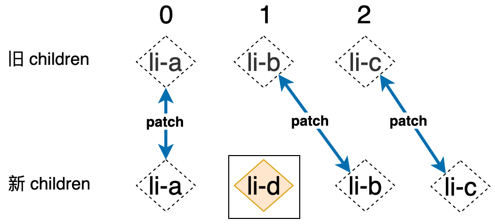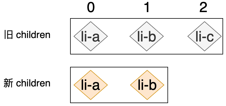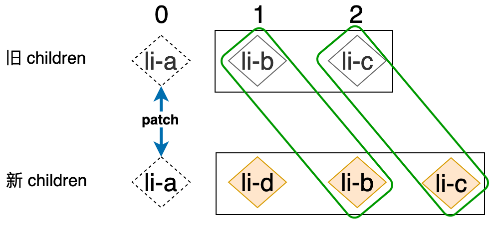 我们来看一下,如果使用前面讲解的 Diff 算法来更新这对新旧 children 的话,会进行哪些操作:首先,旧 children 的第一个节点和新 children 的第一个节点进行比对(patch),即: