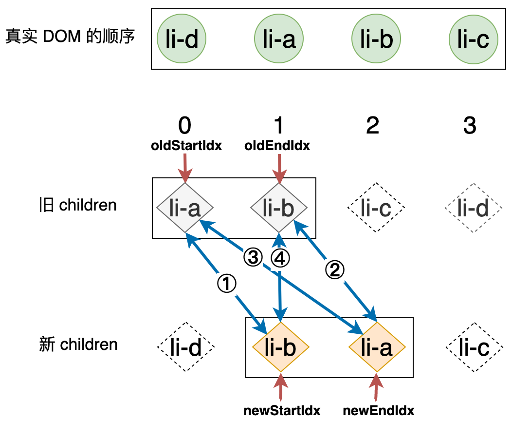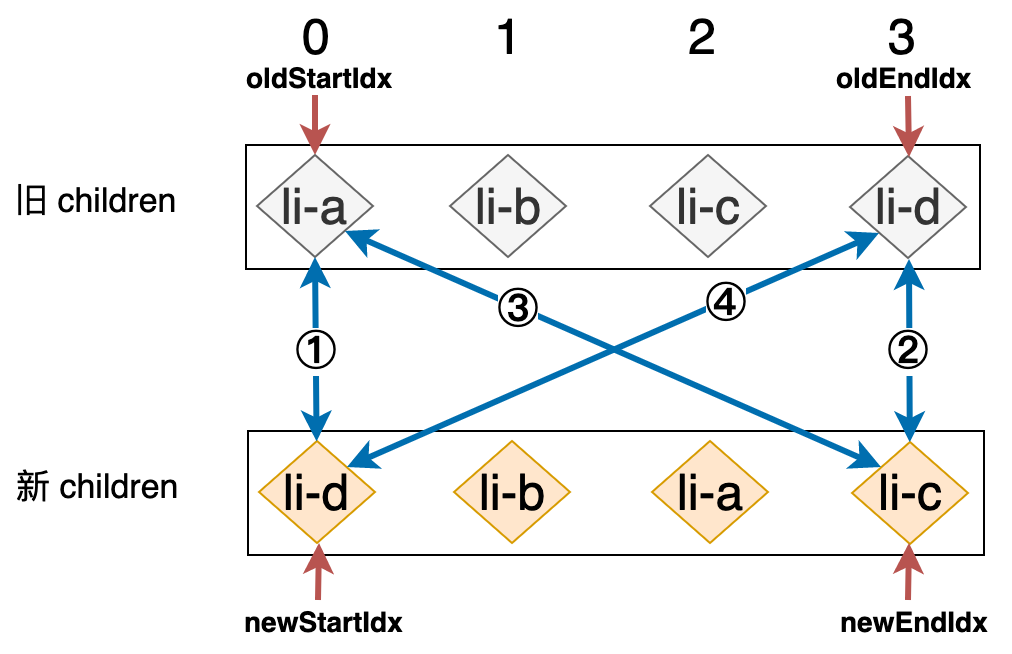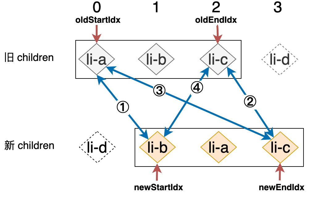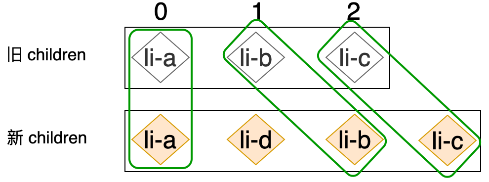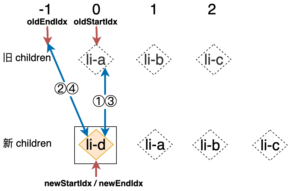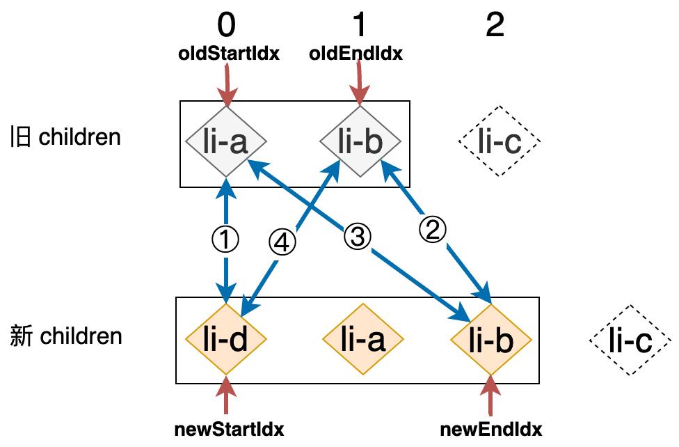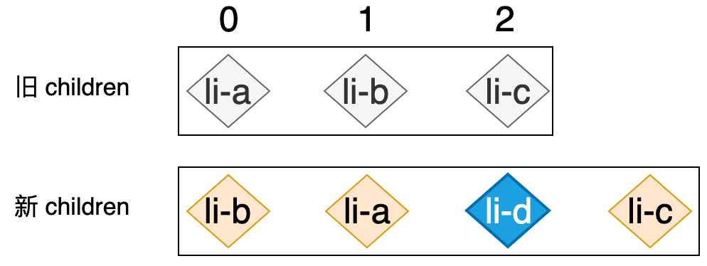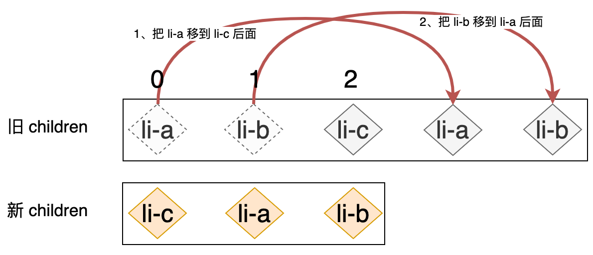新的列表和旧的列表构成了新旧 children,当我们使用简单 Diff 算法更新这两个列表时,其操作行为可以用下图表示: