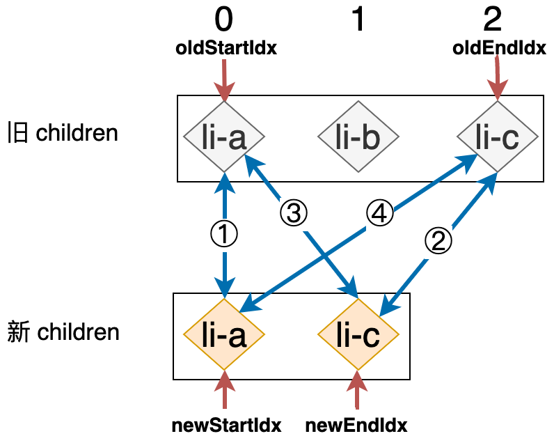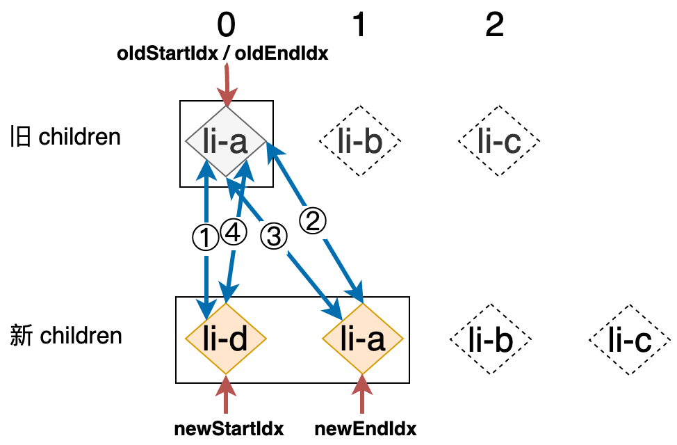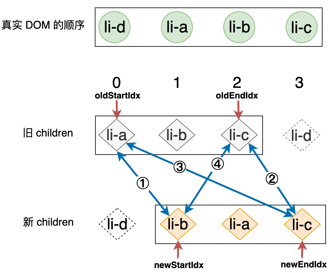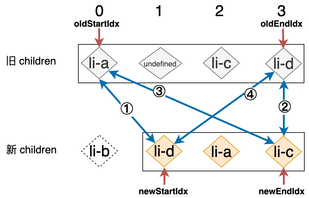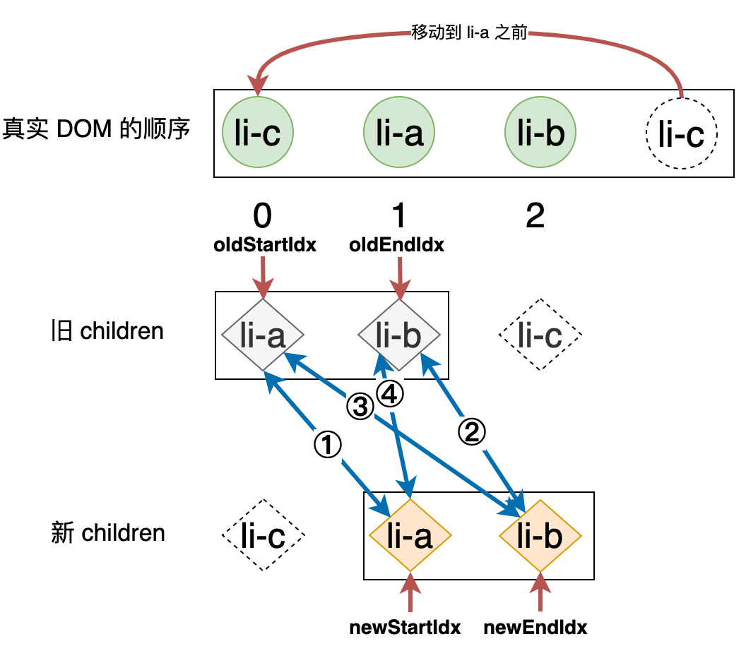 新的列表和旧的列表构成了新旧 children,当我们使用简单 Diff 算法更新这两个列表时,其操作行为可以用下图表示: