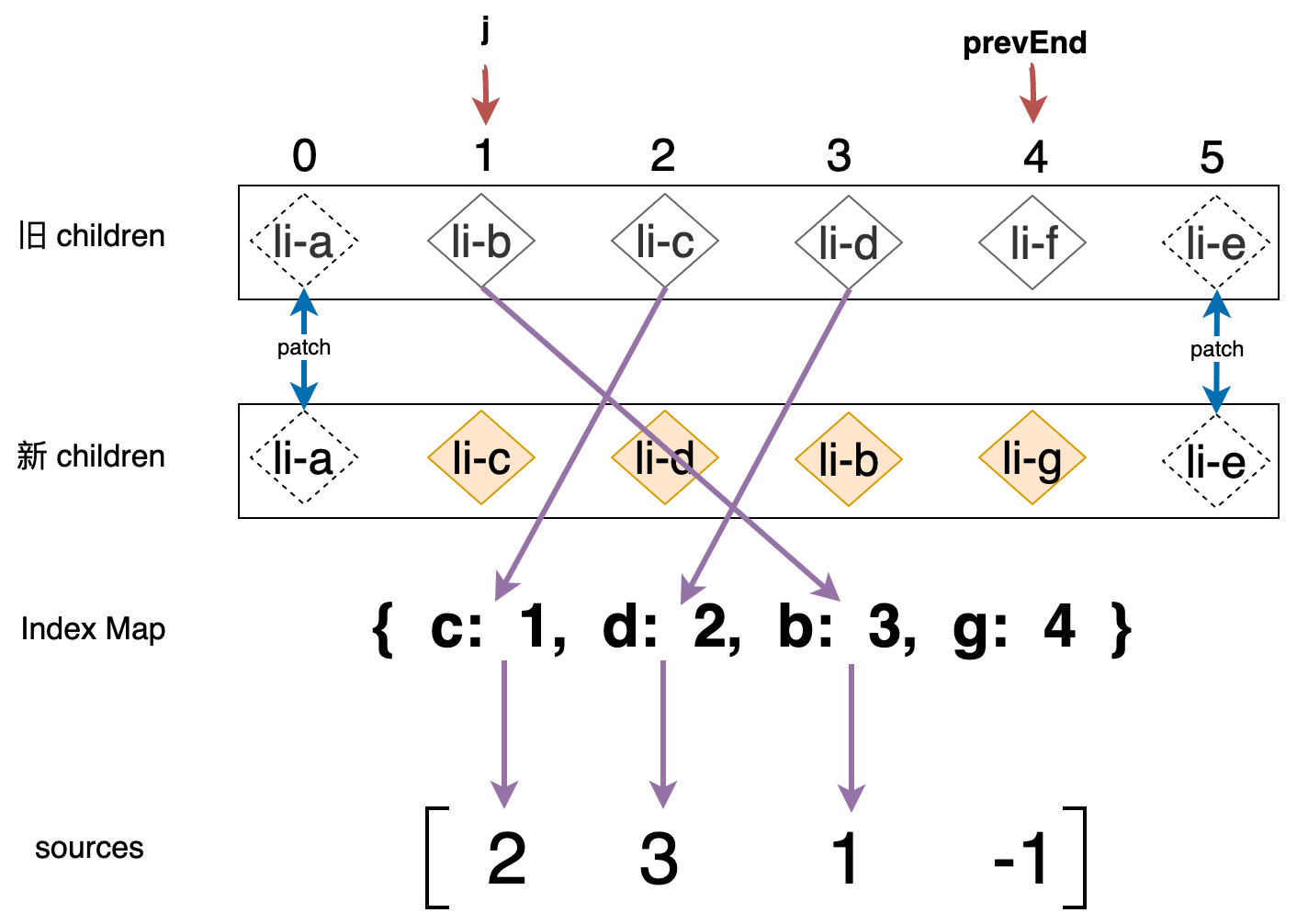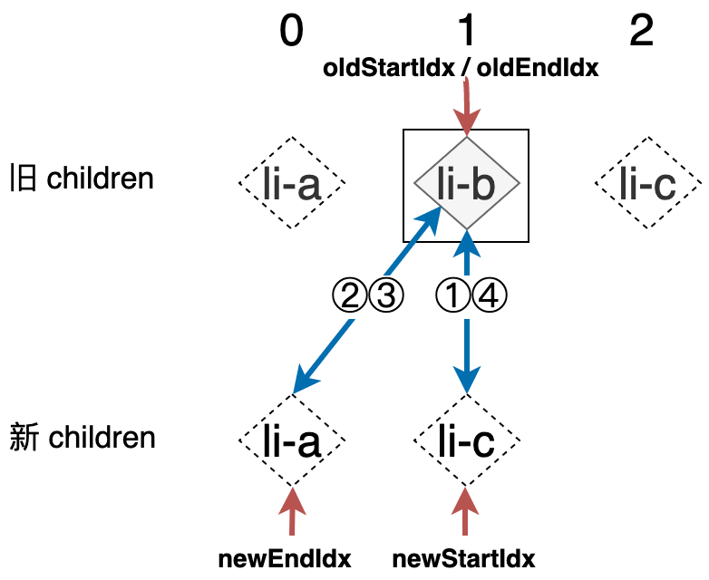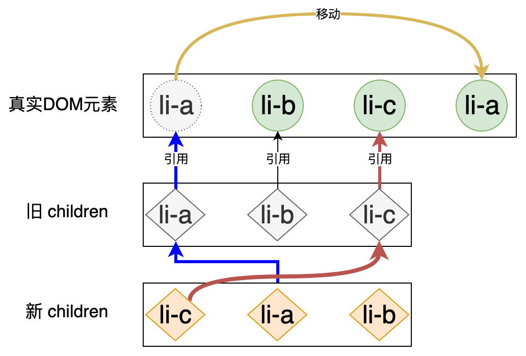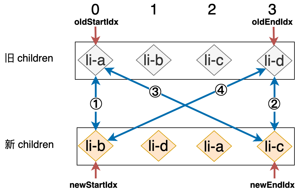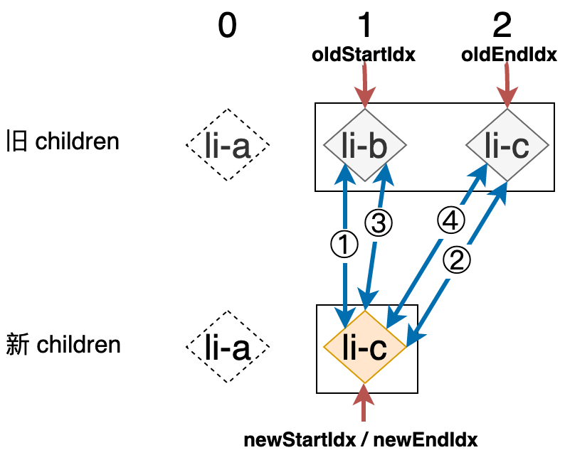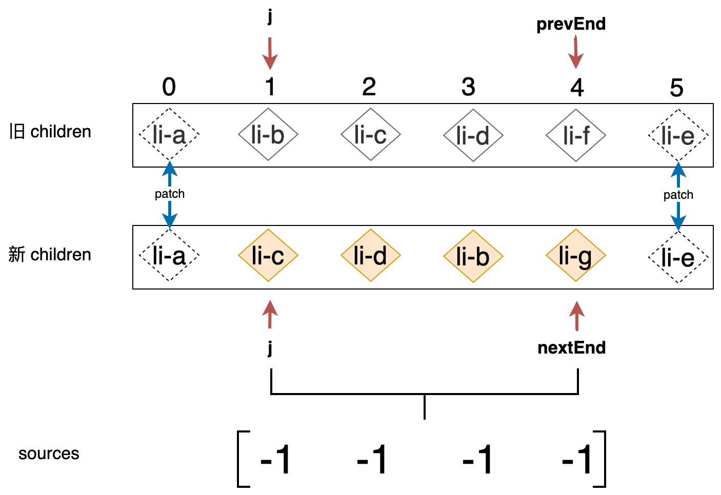新的列表和旧的列表构成了新旧 children,当我们使用简单 Diff 算法更新这两个列表时,其操作行为可以用下图表示: