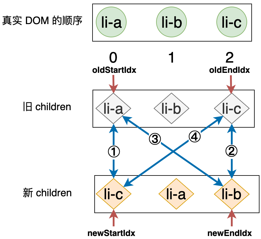 patch 函数知道它们是相同的标签,所以只会更新 VNodeData 和子节点,由于这两个标签都没有 VNodeData,所以只需要更新它们的子节点,旧的 li 元素的子节点是文本节点 '1',而新的 li 标签的子节点是文本节点 '3',所以最终会调用一次 patchText 函数将 li 标签的文本子节点由 '1' 更新为 '3'。接着,使用旧 children 的第二个节点和新 children 的第二个节点进行比对,结果同样是调用一次 patchText 函数用以更新 li 标签的文本子节点。类似的,对于新旧 children 的第三个节点同样也会调用一次 patchText 函数更新其文本子节点。而这,就是问题所在,实际上我们通过观察新旧 children 可以很容易的发现:新旧 children 中的节点只有顺序是不同的,所以最佳的操作应该是通过移动元素的位置来达到更新的目的。