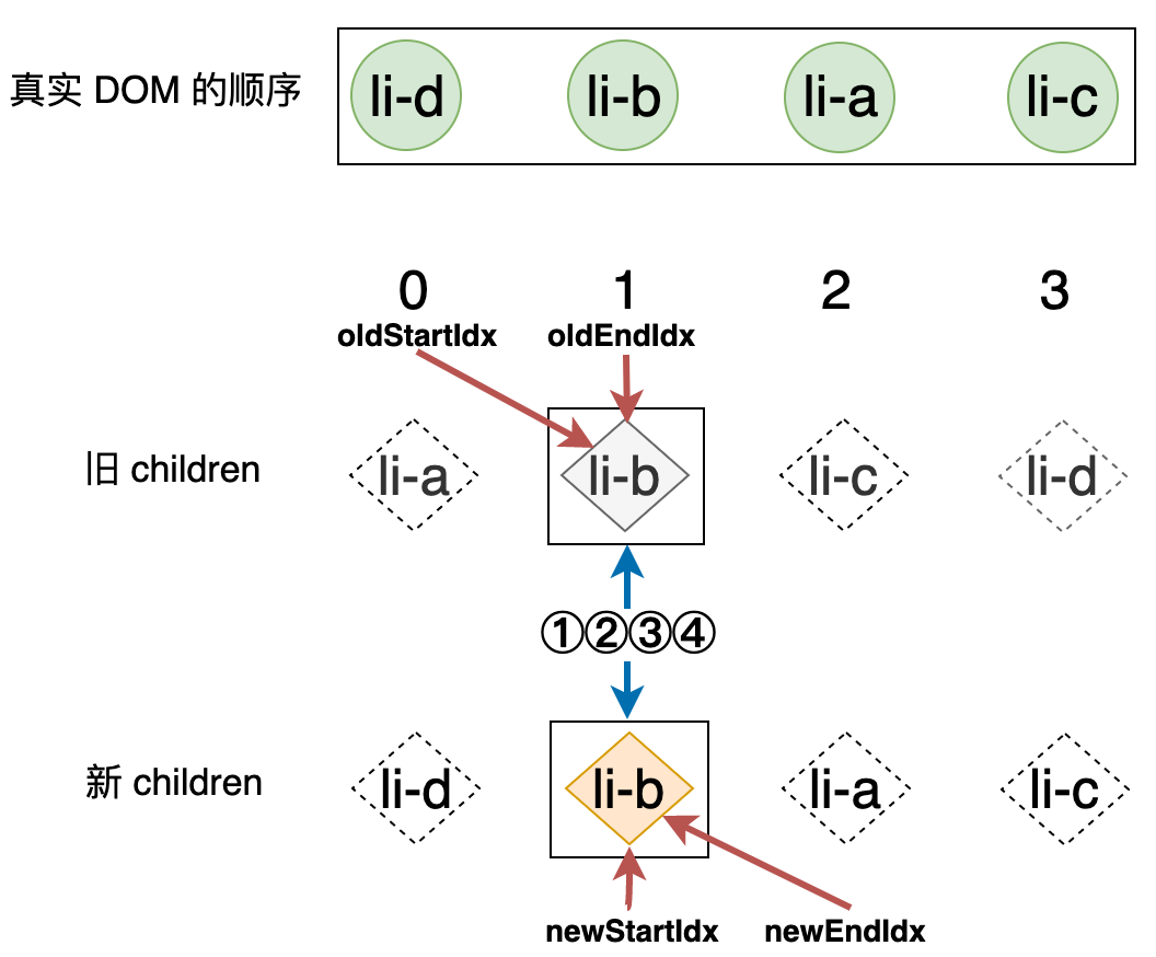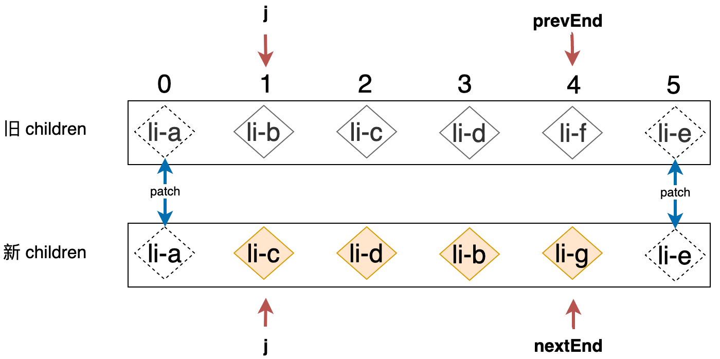 如上代码的关键在于,为了将节点挂载到正确的位置,我们需要找到当前节点的真实位置索引(i + nextStart),以及当前节点的后一个节点,并挂载该节点的前面即可。这样我们就完成了 li-g 节点的挂载。接着循环会继续执行,索引 i 将指向下一个位置,即指向 li-b 节点,如下图所示: