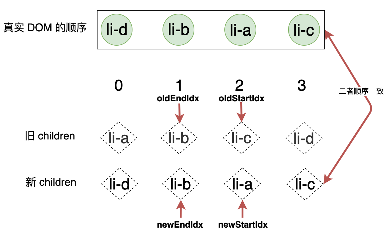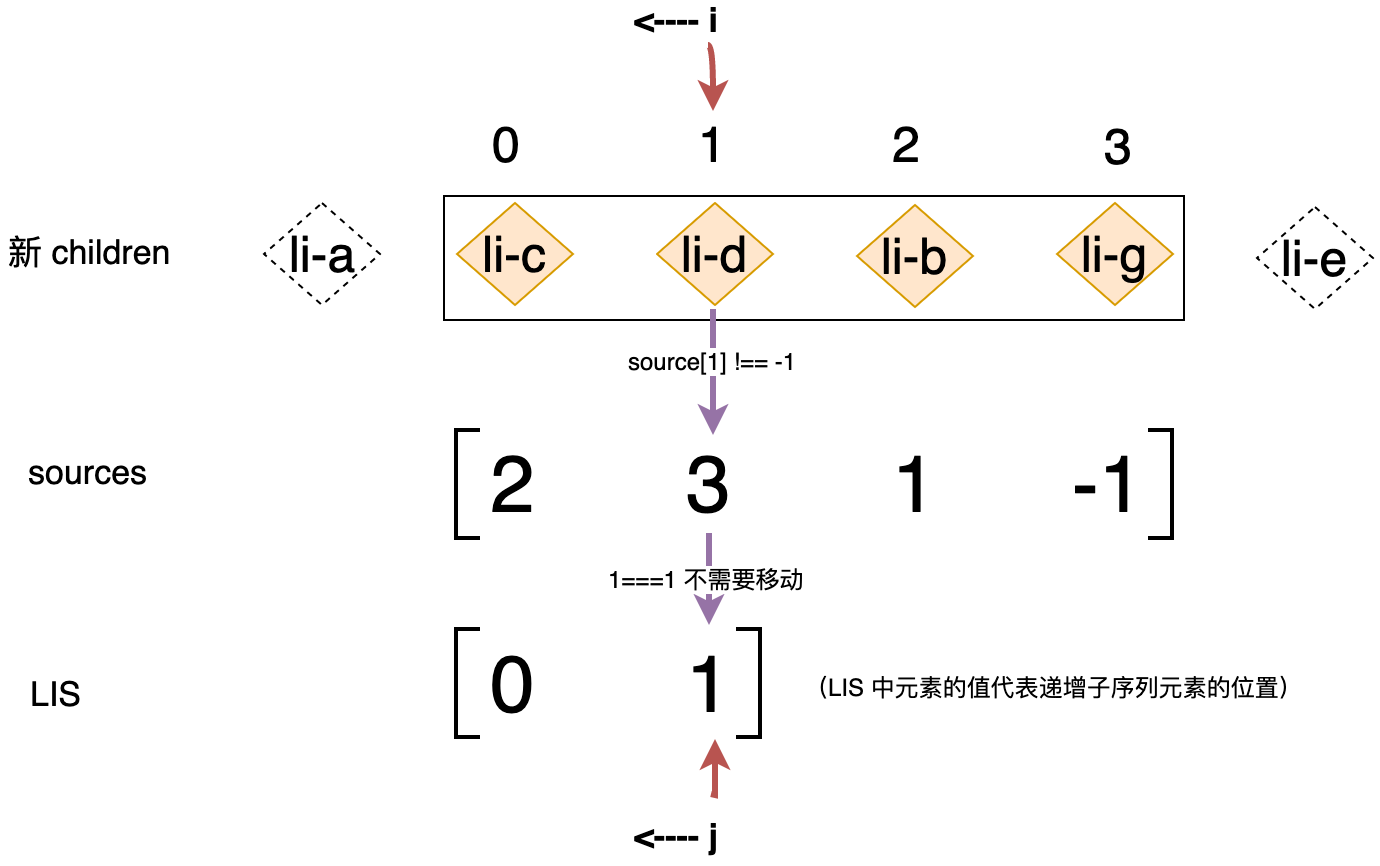 此时索引 j 依然指向子序列的最后一个位置,索引 i 的值为 1,它指向 li-d 节点。同样的,由于 source[1] 的值为 3 不等于 -1,说明 li-d 节点也不是全新的节点。接着判断 li-d 节点的位置索引 i 的值与子序列 seq[j] 的值相等,都为 1,这说明 li-d 节点不需要被移动,此时会把索引 j 指向下一个位置,结束本次循环并开启下一次循环,下一次循环时的状态如下图所示: