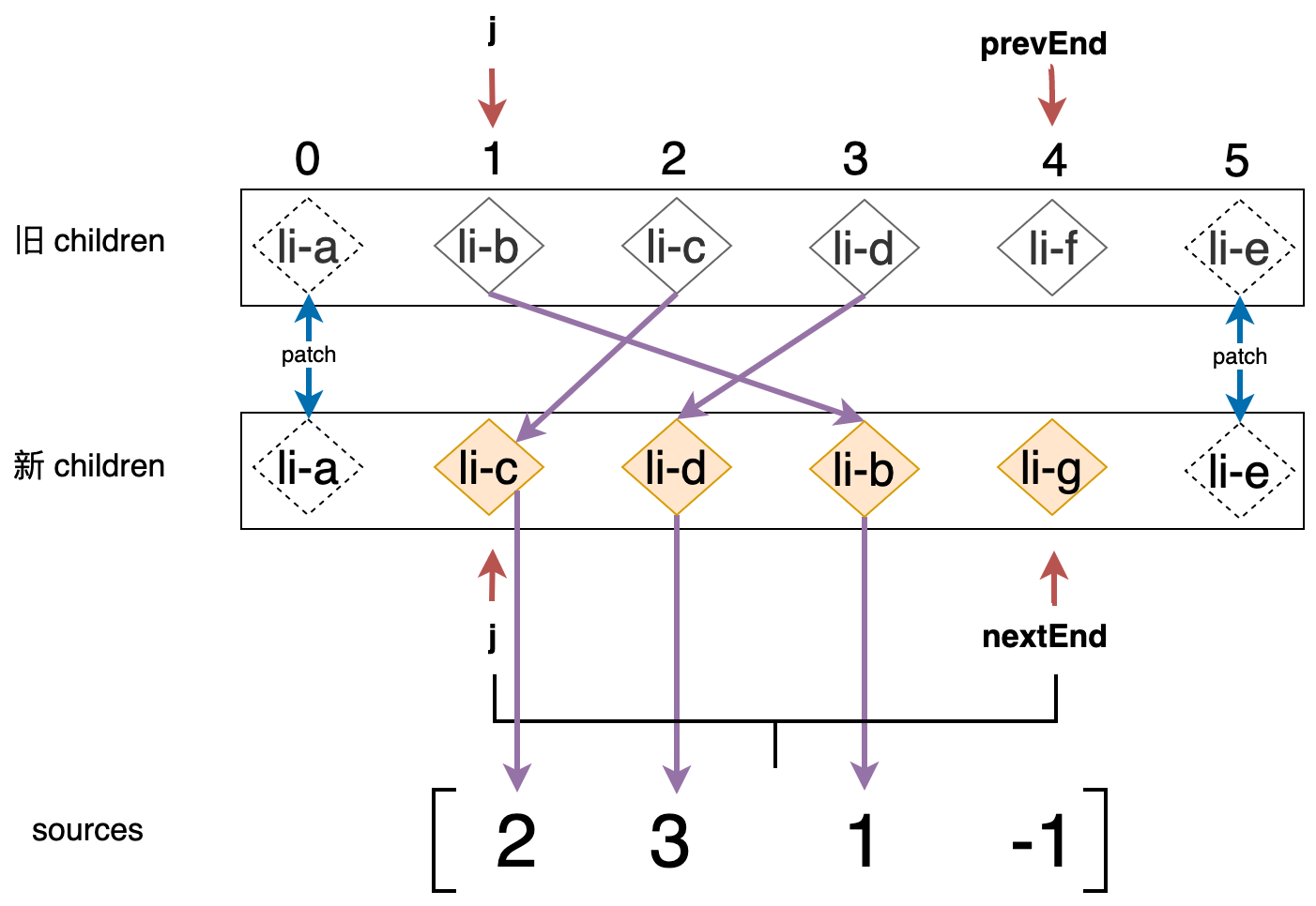 在上一小节,我们的主要目的有两个:1、判断出是否需要进行 DOM 移动操作,所以我们建立了 moved 变量作为标识,当它的值为 true 时则说明需要进行 DOM 移动;2、构建 source 数组,它的长度与“去掉”相同的前置/后置节点后新 children 中剩余未处理节点的数量相等,并存储着新 children 中的节点在旧 children 中位置,后面我们会根据 source 数组计算出一个最长递增子序列,并用于 DOM 移动操作。如下图所示: