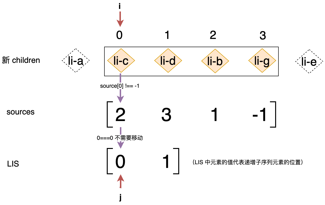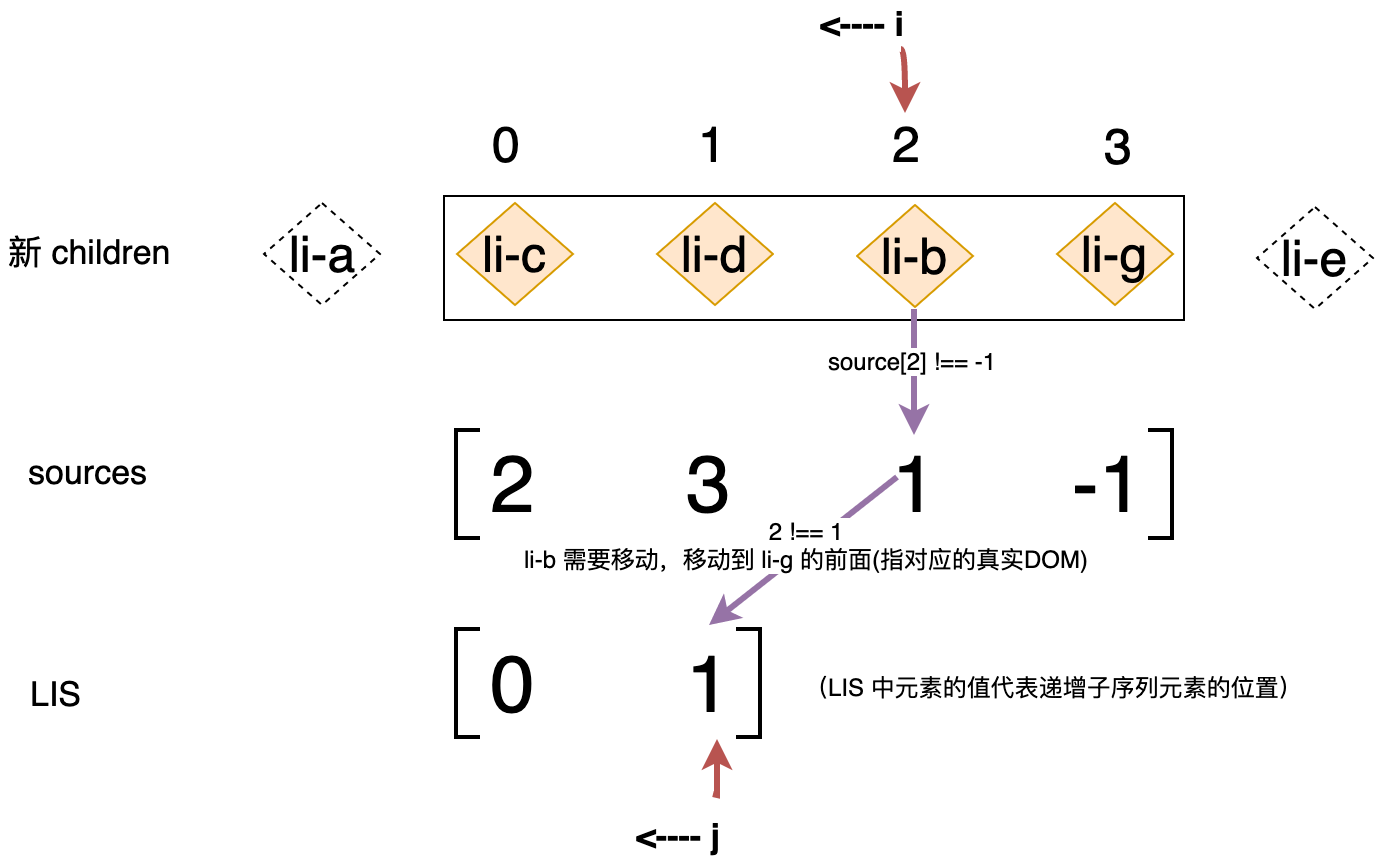 变量 j 指向最长递增子序列的最后一个位置,使用 for 循环从后向前遍历新 children 中剩余未处理的子节点,这里的技巧在于 i 的值的范围是 0 到 nextLeft - 1,这实际上就等价于我们对剩余节点进行了重新编号。接着判断当前节点的位置索引值 i 是否与子序列中位于 j 位置的值相等,如果不相等,则说明该节点需要被移动;如果相等则说明该节点不需要被移动,并且会让 j 指向下一个位置。但是我们观察上图可以发现 li-g 节点的位置索引是 3,它不等于 1(seq[j]),难道说明 li-g 节点需要被移动吗?其实不是,我们还可以发现与 li-g 节点位置对应的 source 数组中的元素值为 -1,这说明 li-g 节点应该作为全新的节点挂载,所以我们还需增加一个判断,优先检查一个节点是否是全新的节点: