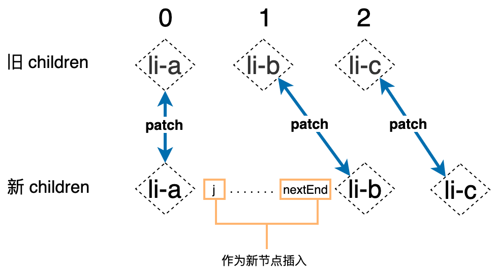 通过分析我们得出一个规律,我们不应该总是遍历旧的 children,而是应该遍历新旧 children 中长度较短的那一个,这样我们能够做到尽可能多的应用 patch 函数进行更新,然后再对比新旧 children 的长度,如果新的 children 更长,则说明有新的节点需要添加,否则说明有旧的节点需要移除。最终我们得到如下实现: