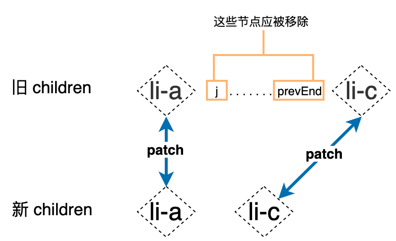 变量 patched 将作为数量标识,它的初始值为 0,只有当条件 patched < nextLeft 不成立时,说明该节点已经不存在与新 children 中了,是一个多余的节点,于是我们将其移除。