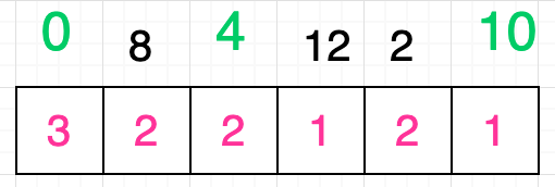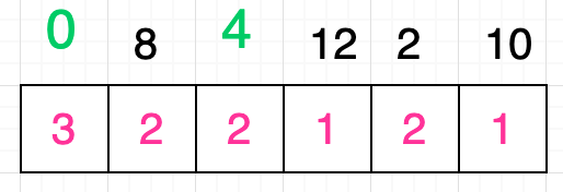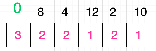 很显然条件 8 < 4 不成立,什么都不做;条件 8 < 12 成立,拿出数字 12 对应格子中的值:1,为这个值再加 1 得出的值为 2,大于数字 8 对应格子的当前值,所以更新该格子的值为 2;条件 8 < 2 也不成立,什么都不做;条件 8 < 10 成立,拿出数字 10 对应格子中的值 1,为这个值再加 1 得出的值为 2,不大于数字 8 所对应格子中的值,所以什么都不需要做,最终我们为数字 8 所对应的格子填充的值是 2: