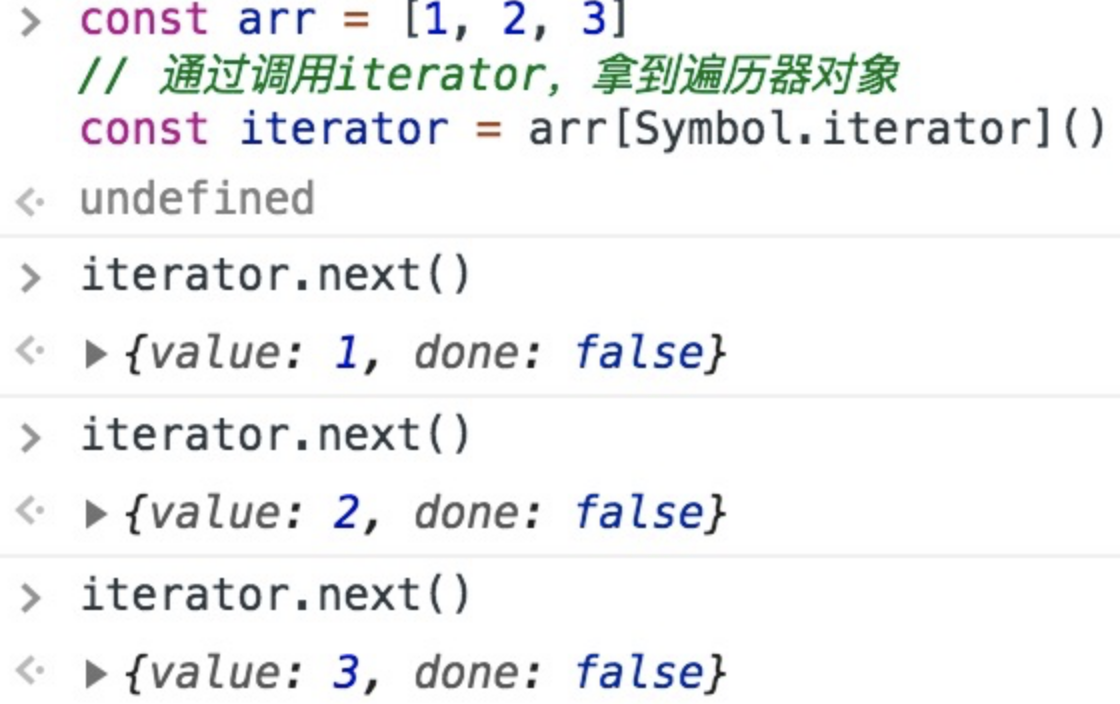 ps:此处推荐阅读迭代协议 (opens new window) (opens new window),相信大家读过后会对迭代器在ES6中的实现有更深的理解。