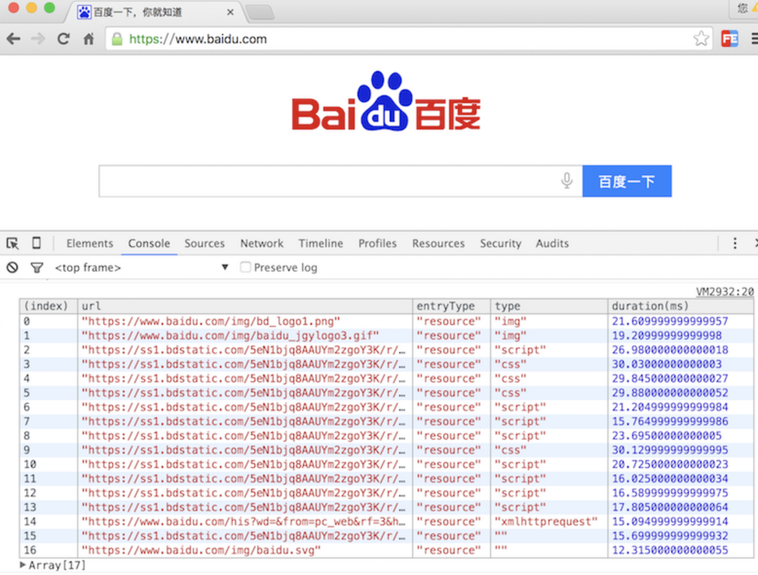 window.performance.getEntries方法,则可以以数组形式,返回这些请求的时间统计信息,每个数组成员均是一个PerformanceResourceTiming对象!