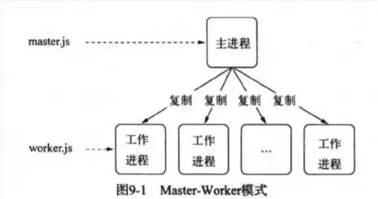 child_process模块,来实现进程的复制,node 的多进程架构是主从模式,如下所示: