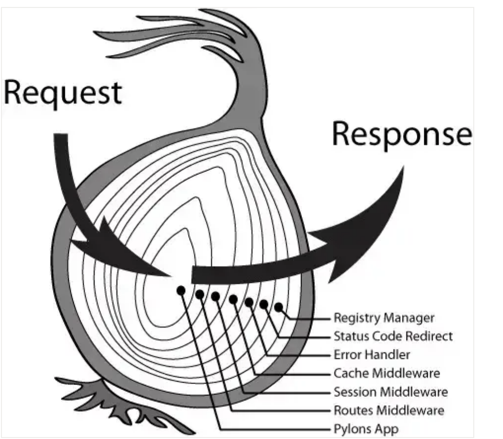 - 中间件执行就像洋葱一样,最早 use 的中间件,就放在最外层。处理顺序从左到右,左边接收一个 request,右边输出返回 response
